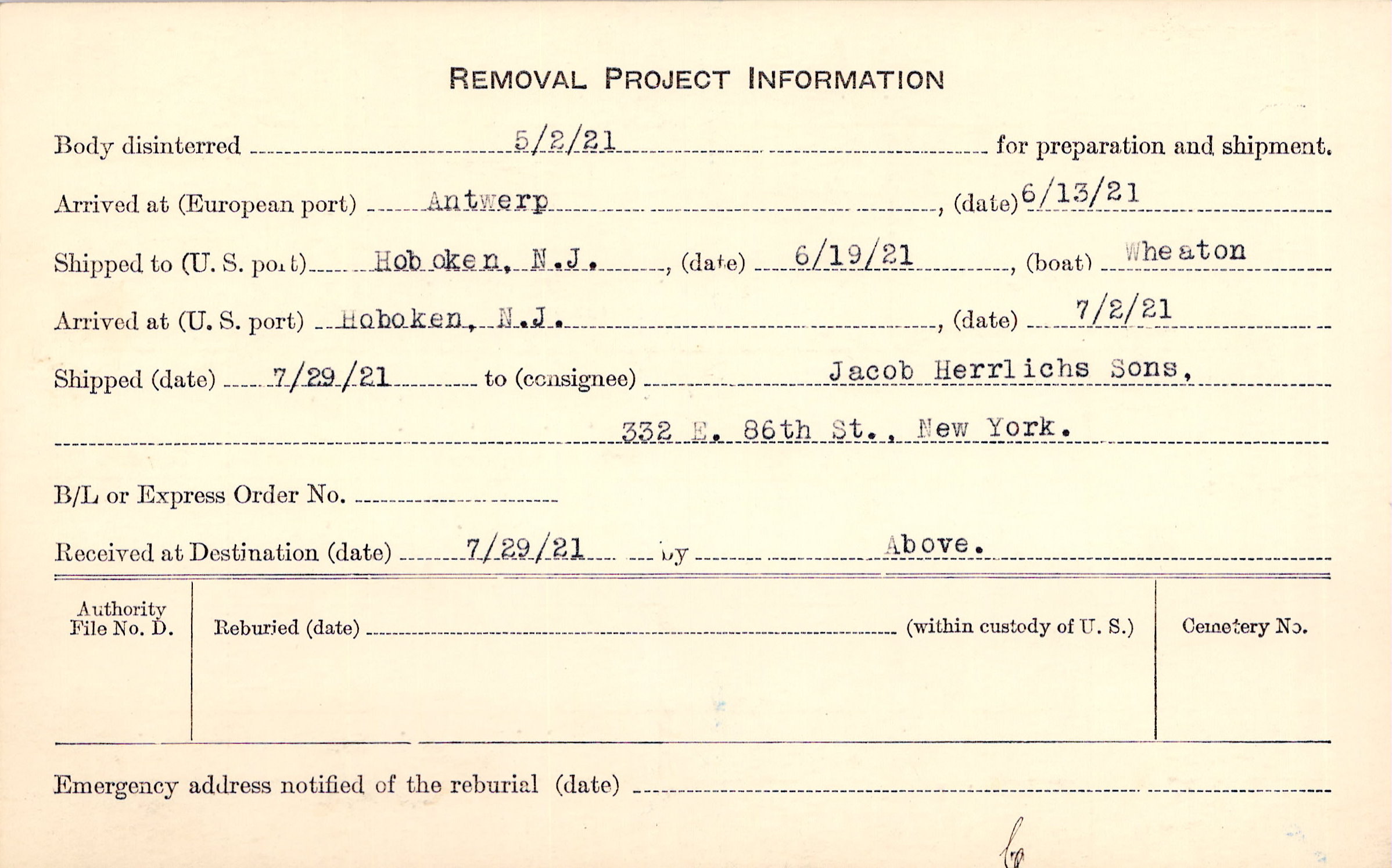 Body disinterred 5/2/1921 for preparation and shipment.