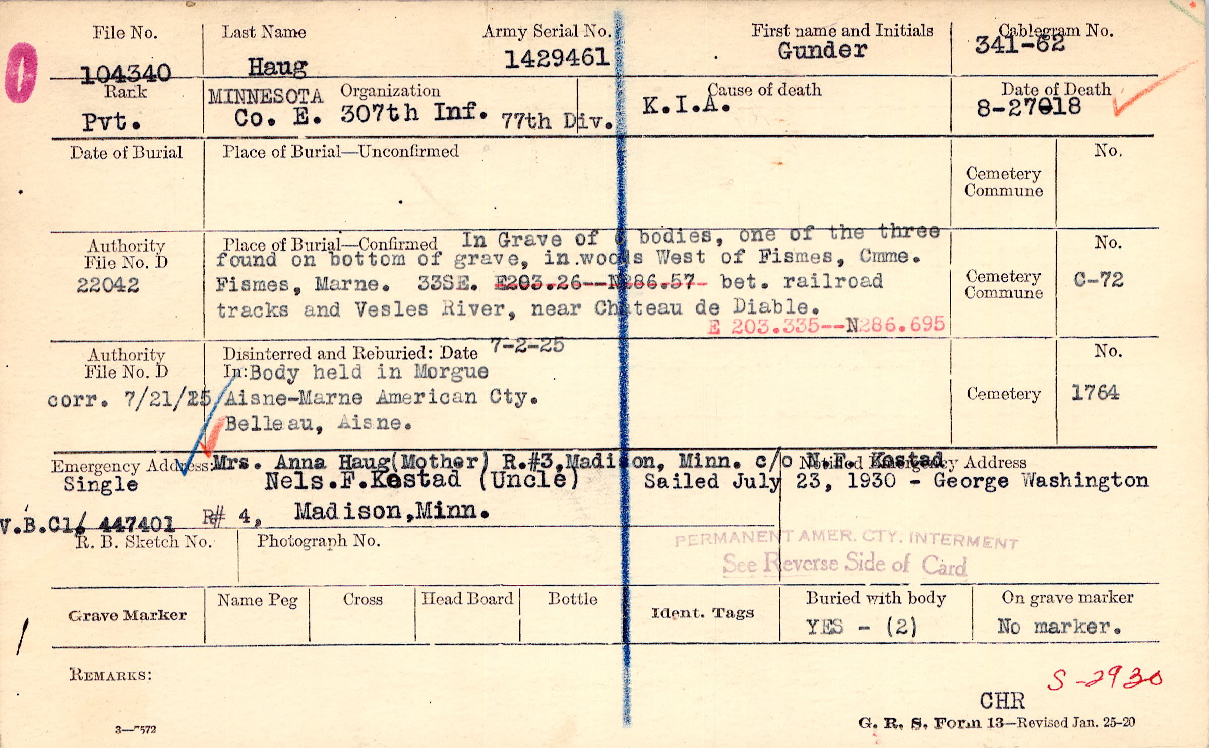 American Cemetery, Belleau, Aisne, Body held in Morgue