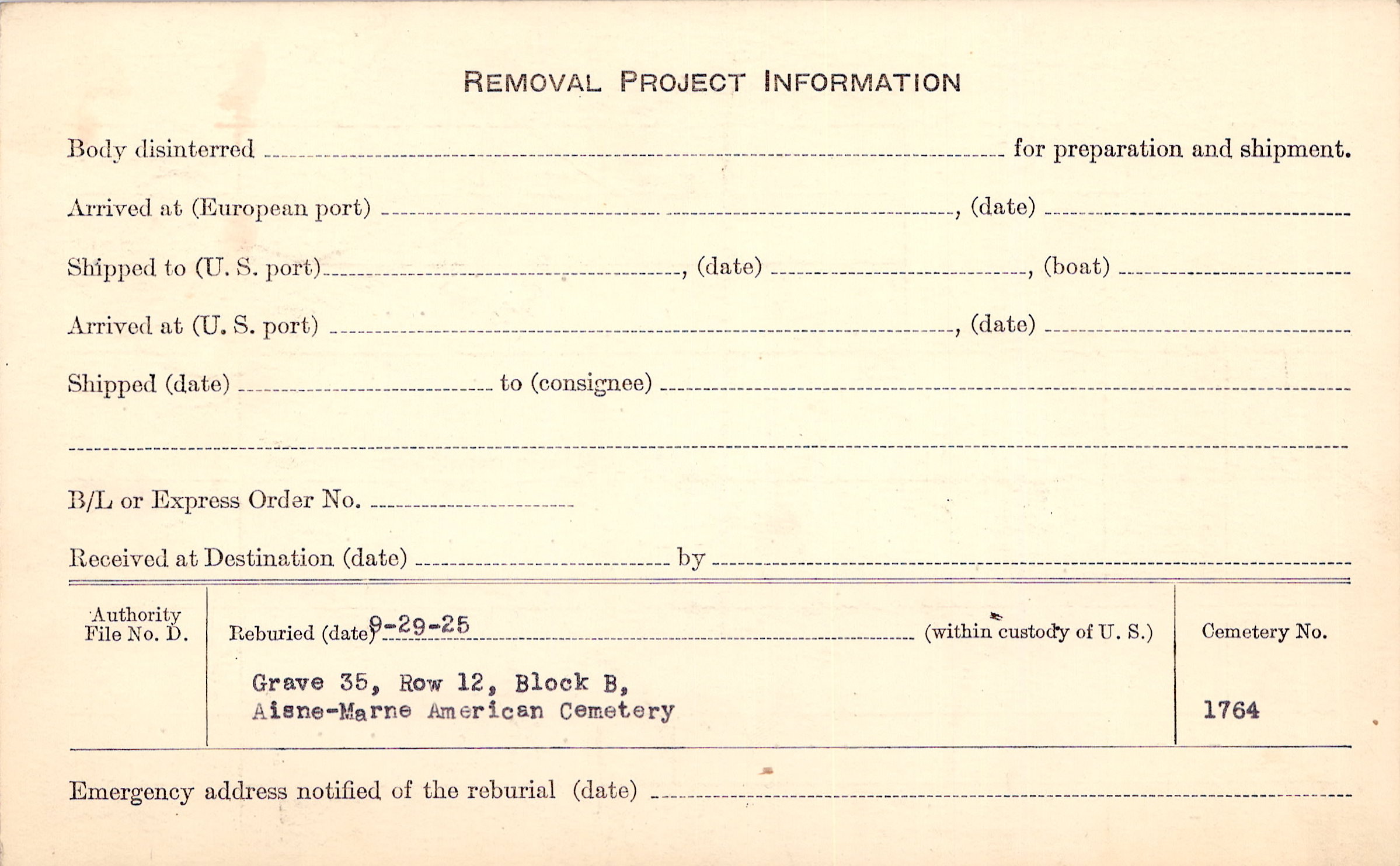 In Grave of 6 bodies, one of the three found on bottom of grave, in woods West of Fismes, Cmme. Fismes, Marne, 33SE, bet. railroad tracks and Vesles River, near Chateau de Diable.