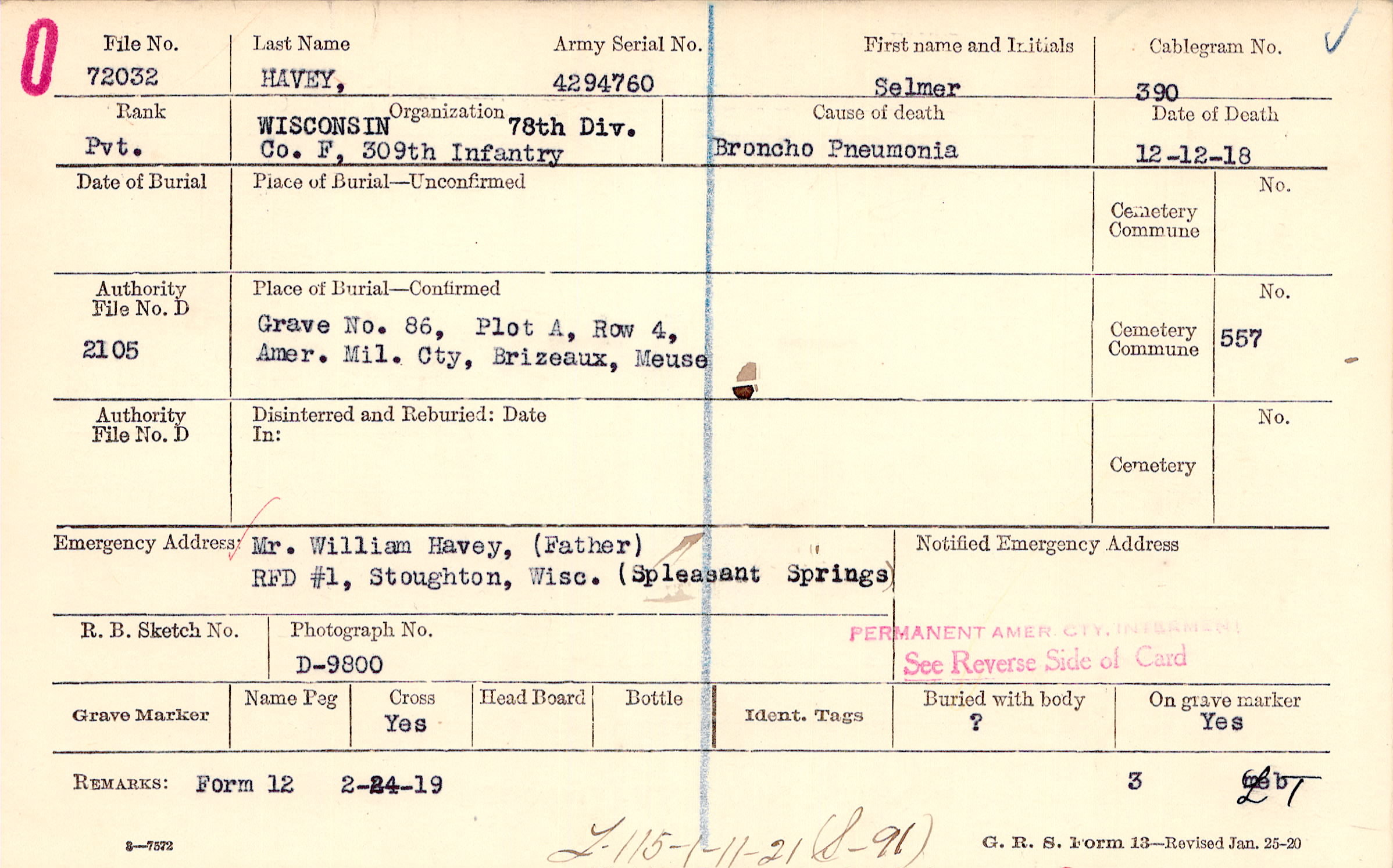Mr. William Havey, (Father), RFD #1, Stoughton, Wisc. (Spleasant Springs)