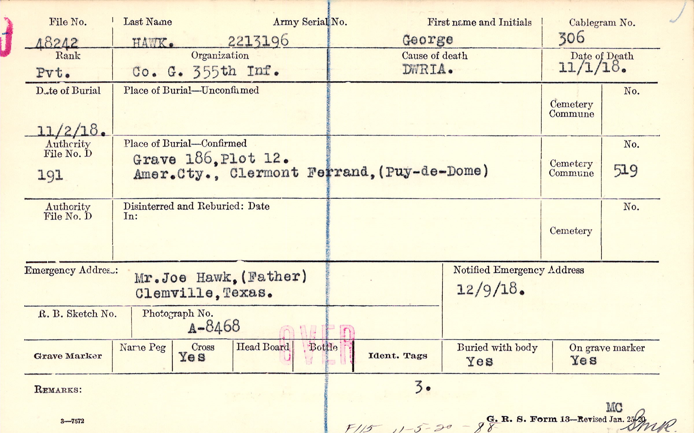 Grave 186, Plot 12., Amer. Cty., Clermont Ferrand, Puy-de-Dome