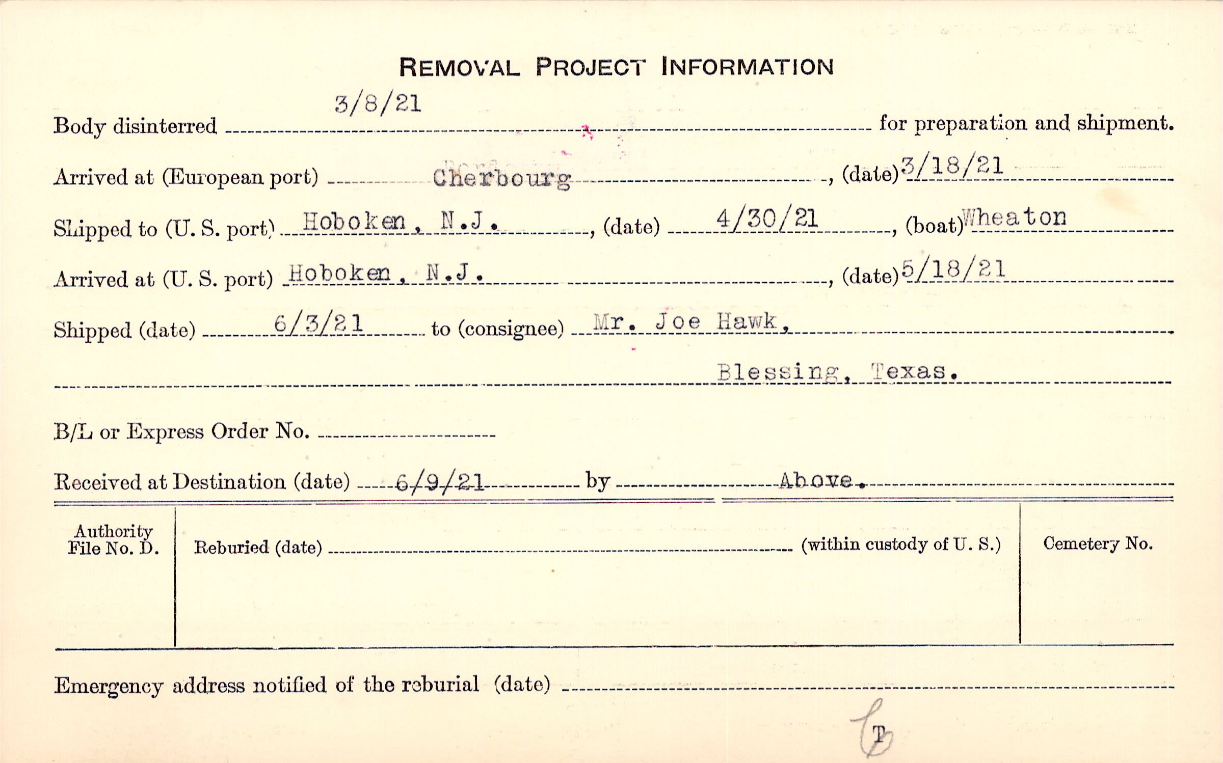 Body disinterred 3/8/1921 for preparation and shipment.