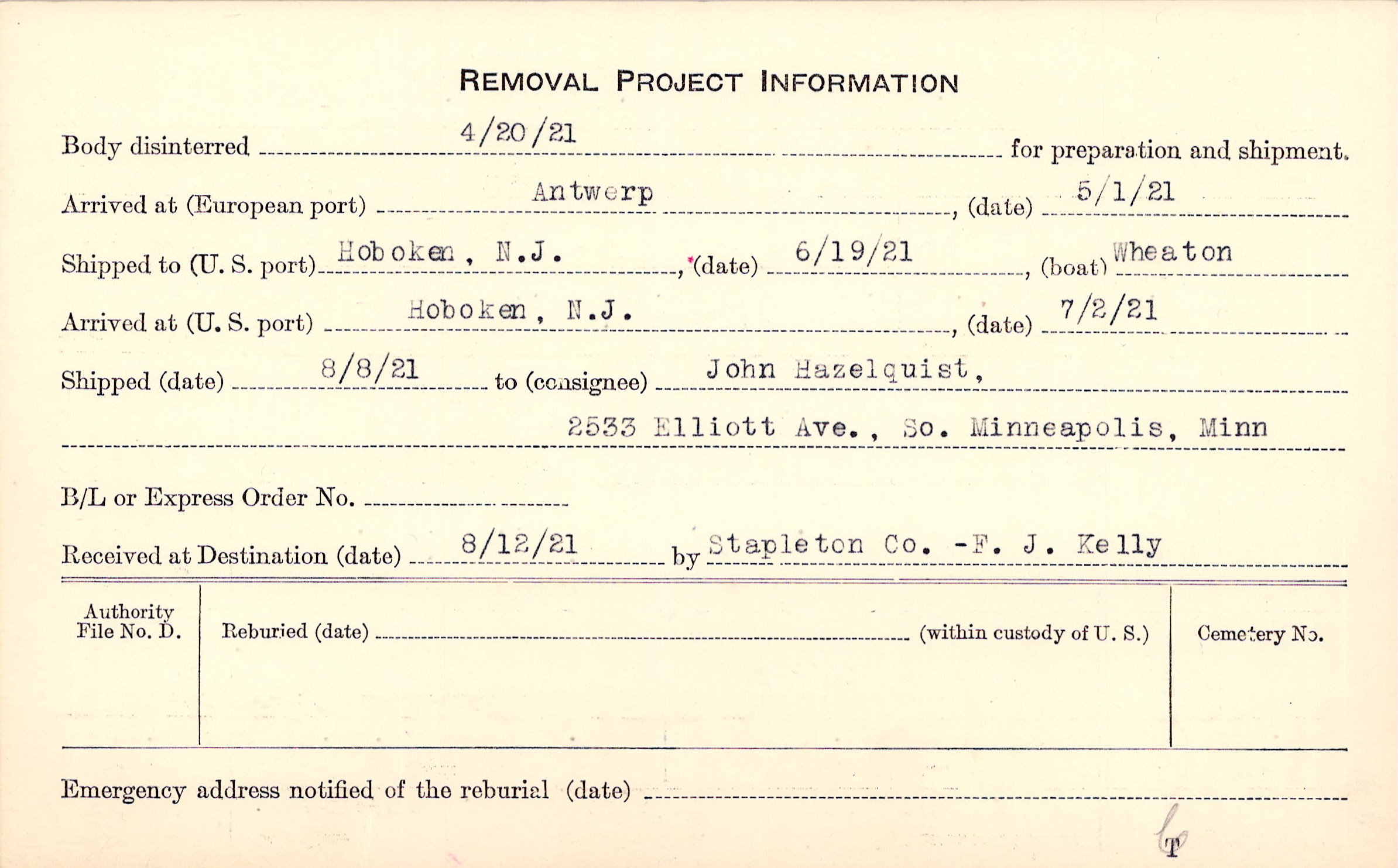 Mr. John Hazelquist, (Father), 2719-12th Ave., South,Minneapolis,Minn., (Beneficiary)