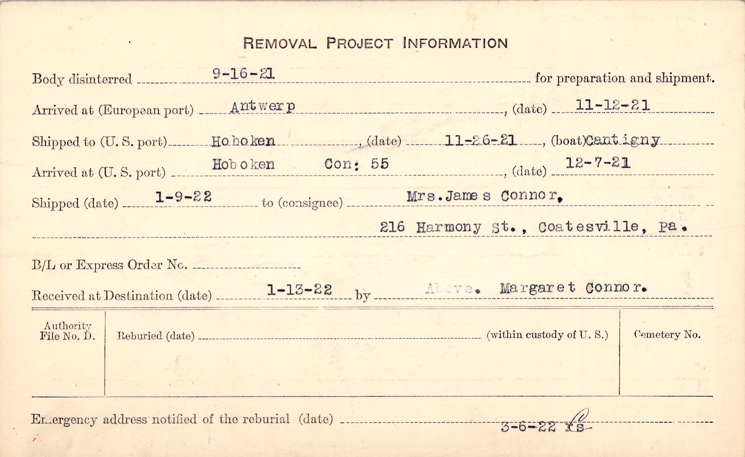 Mrs. James Connor, Aunt, 216 Harmony St., Coatsville, Pa.