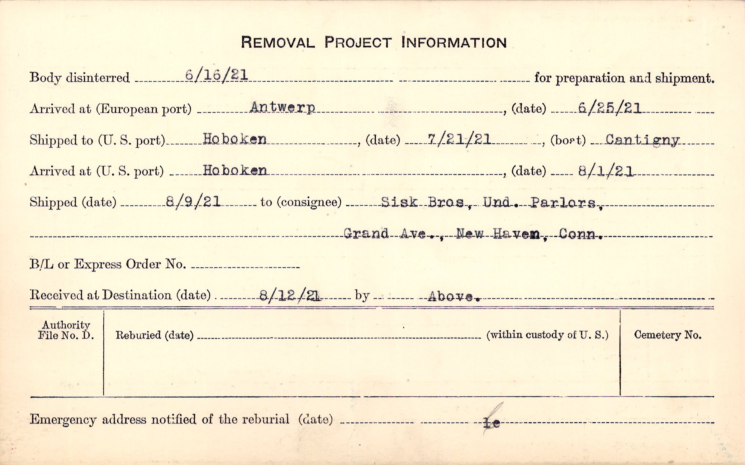 Body disinterred 6/16/1921 for preparation and shipment.