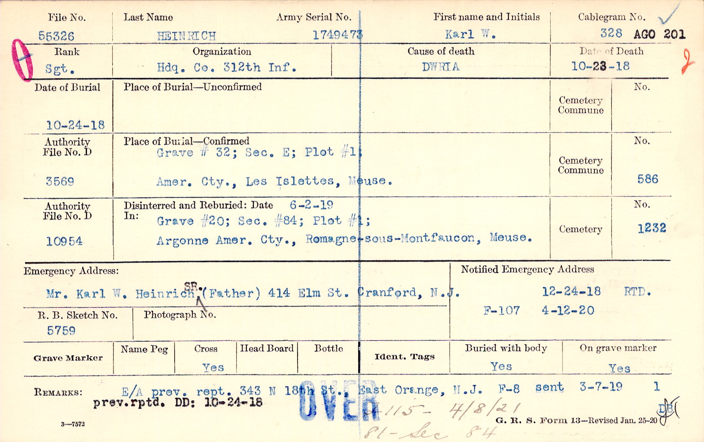 Mr. Karl W. Heinrich Sr. (Father), 414 Elm St. Cranford, N.J.