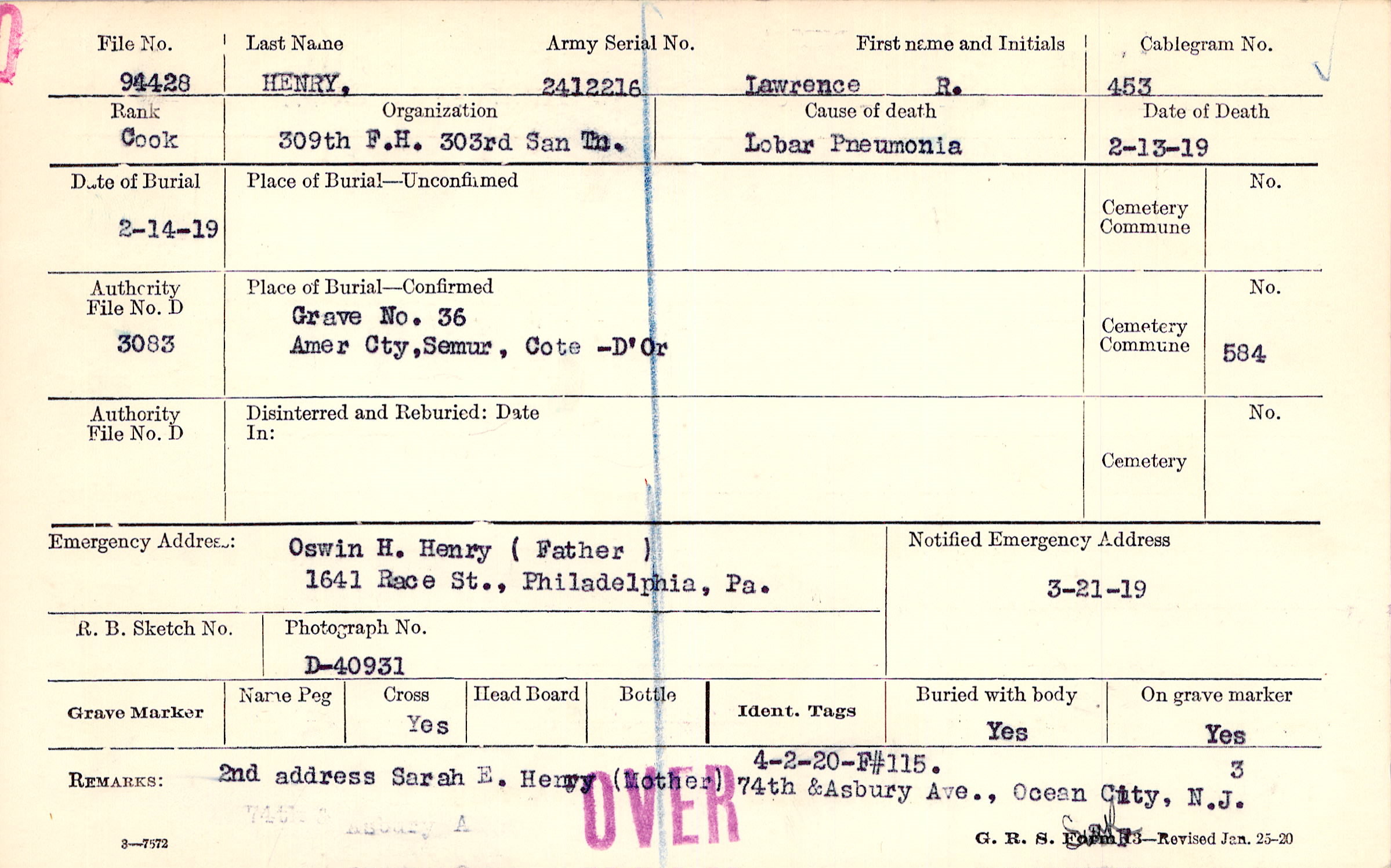 2nd address Sarah E. Henry (Mother) 74th & Asbury Ave., Ocean City, N.J., 4-2-20 - F#115