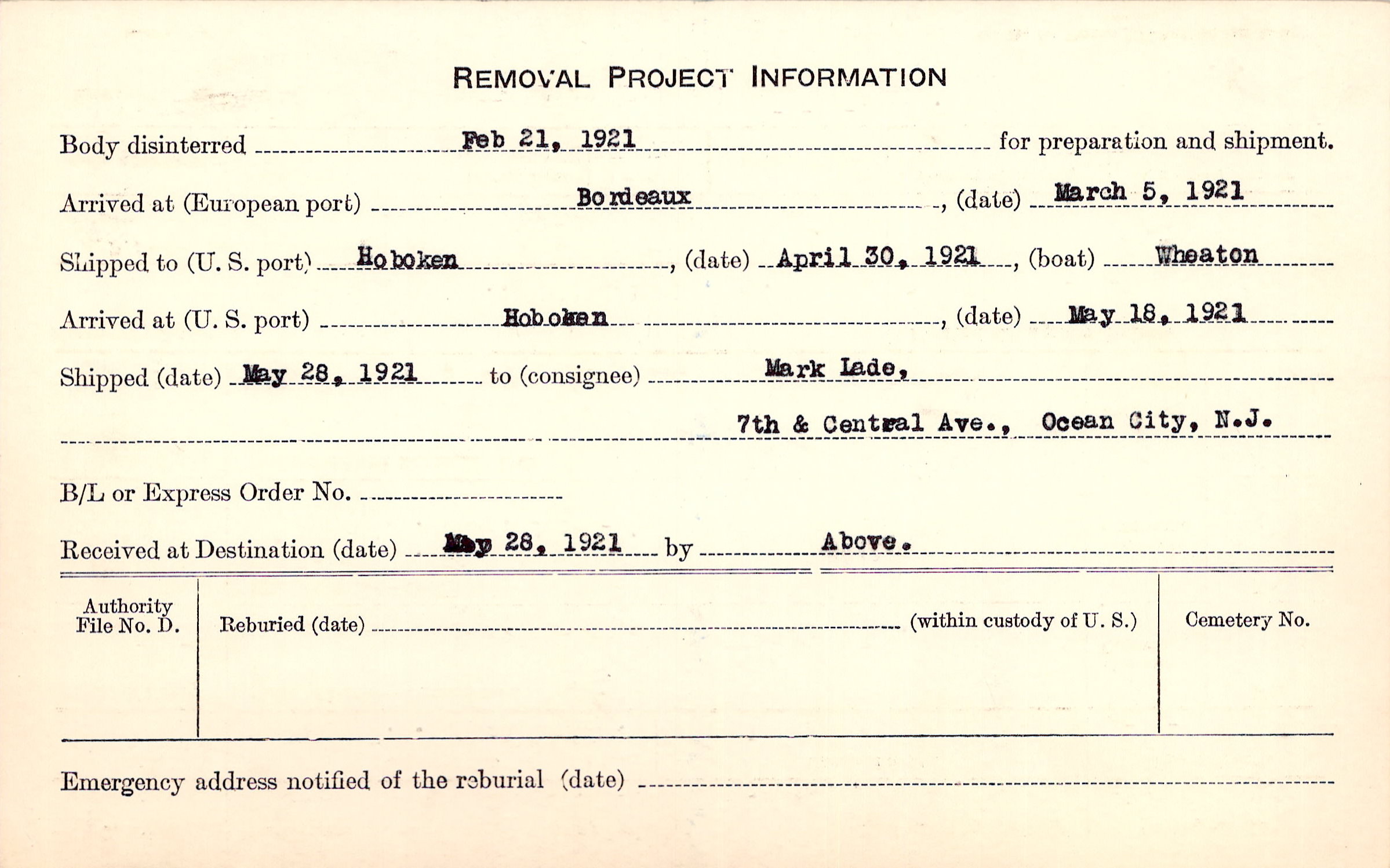 Body disinterred 2/21/1921 for preparation and shipment.
