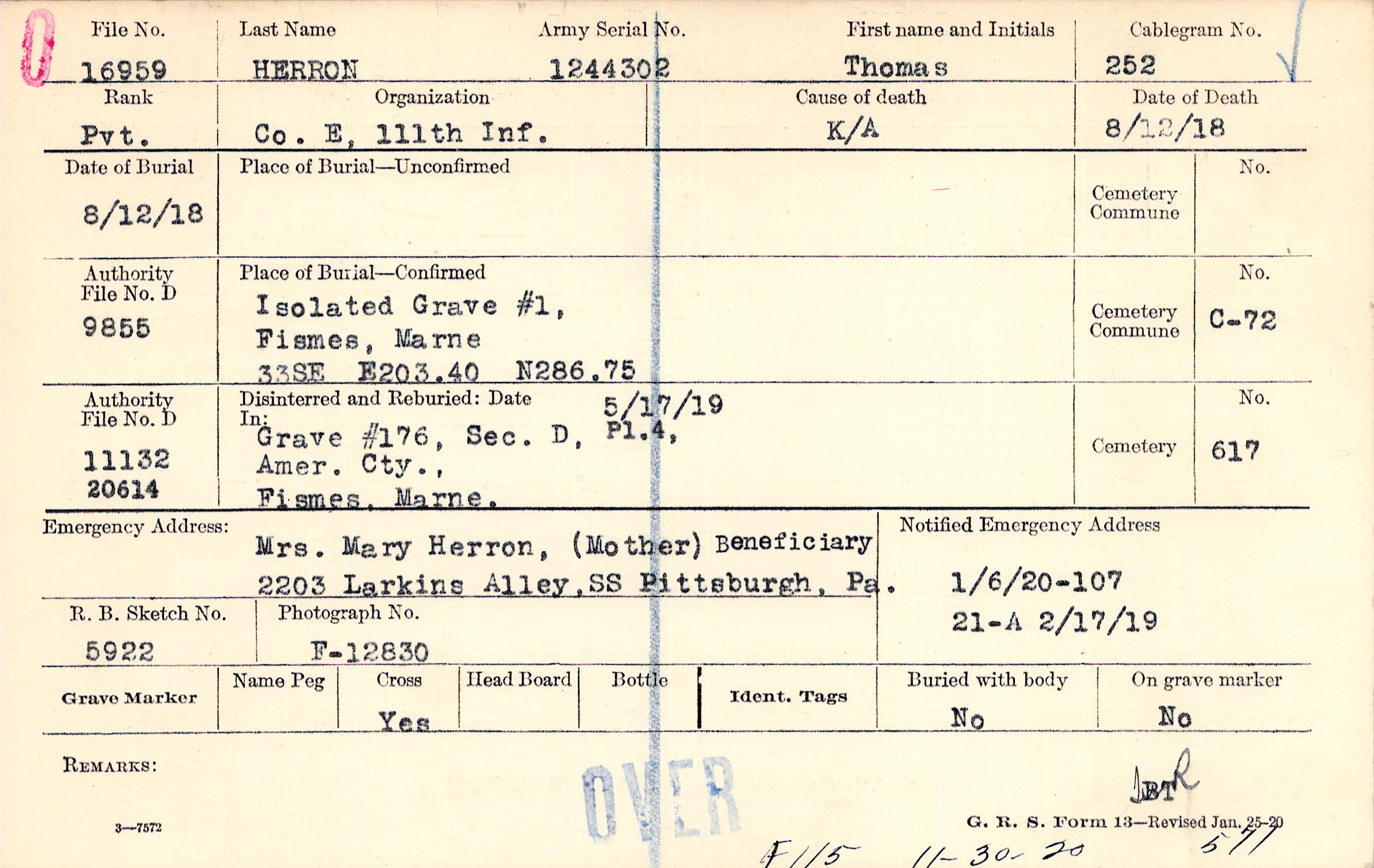 Mrs. Mary Herron, (Mother), 2203 Larkins Alley, SS Pittsburgh, Pa., Beneficiary
