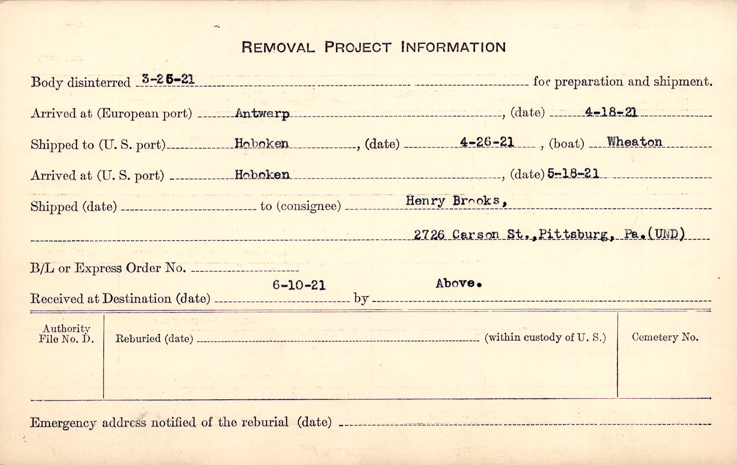 to Henry Brooks, 2726 Carson St., Pittsburg, Pa. (UND)