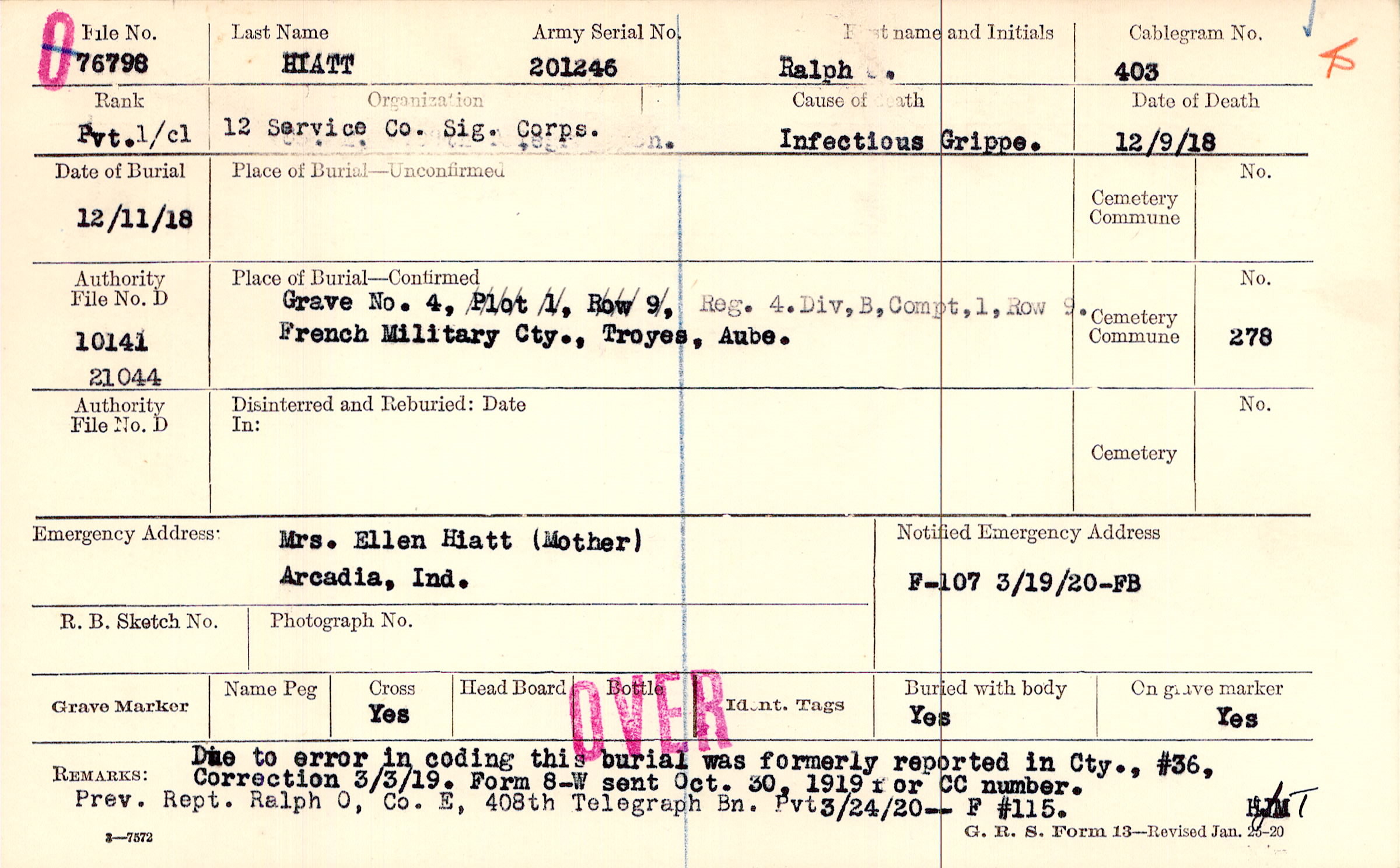 Prev. Rept. Ralph O, Co. E, 408th Telegraph Bn. Pvt, Form 8-W sent Oct. 30, 1919 for CC number., 3/24/20-- F #115.