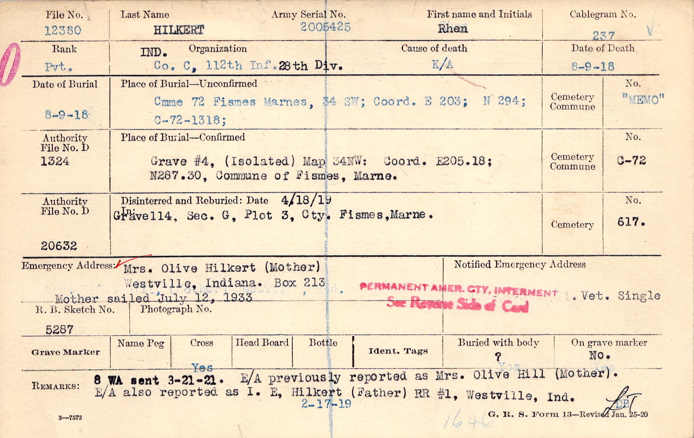 Mrs. Olive Hilkert (Mother), Westville, Indiana. Box 213, Mother sailed July 12, 1933 Vet. Single
