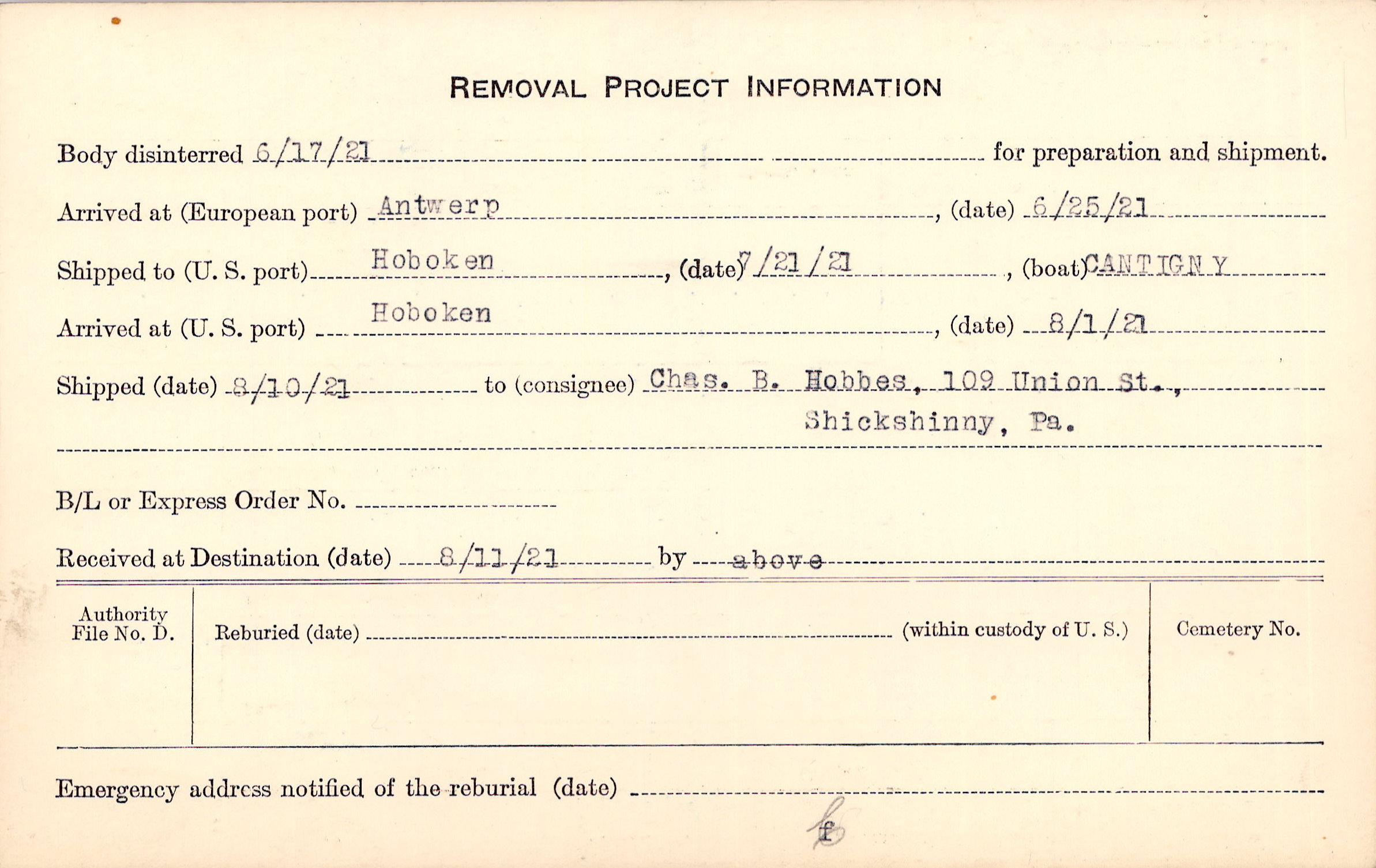 Body disinterred 6/17/1921 for preparation and shipment.