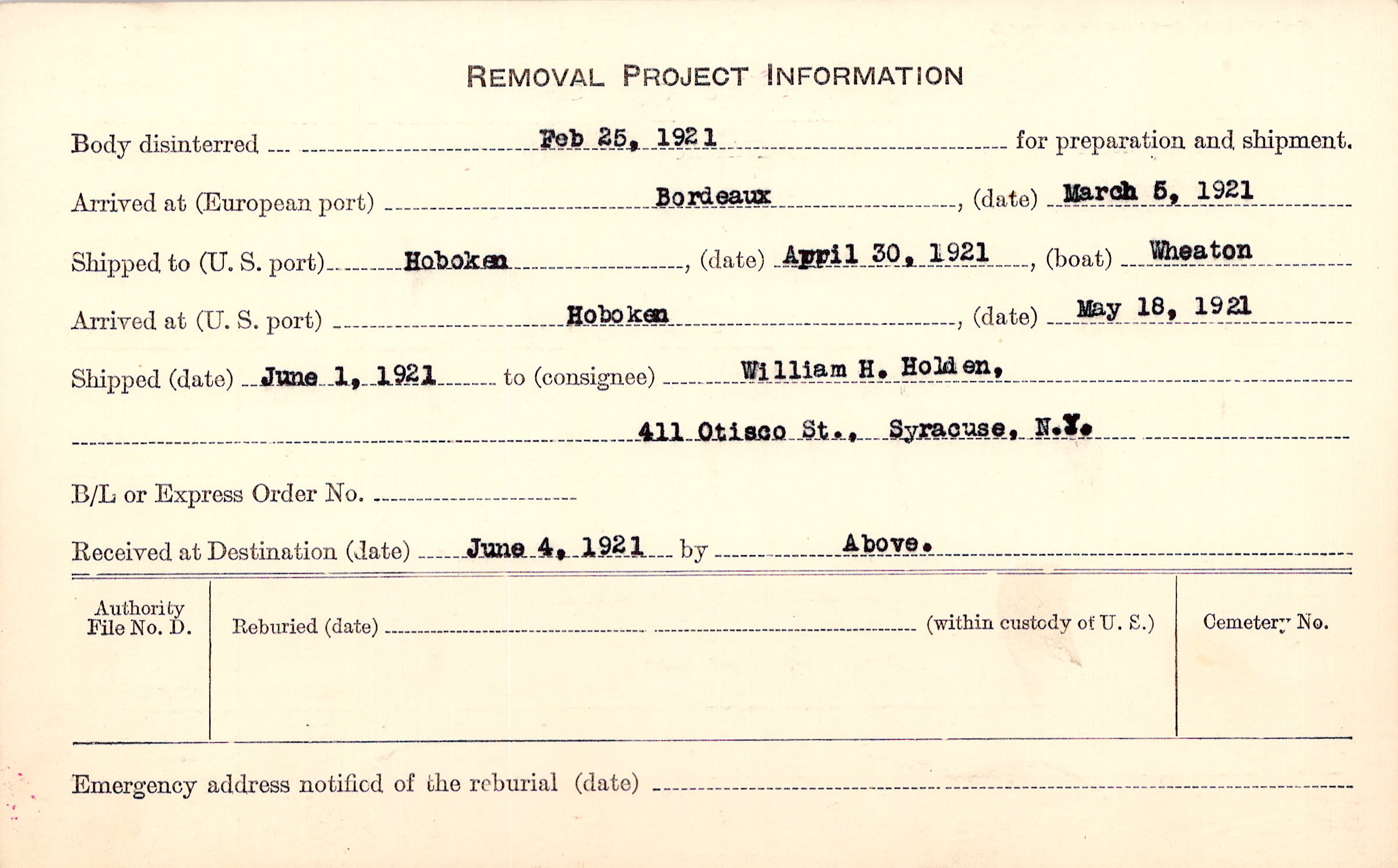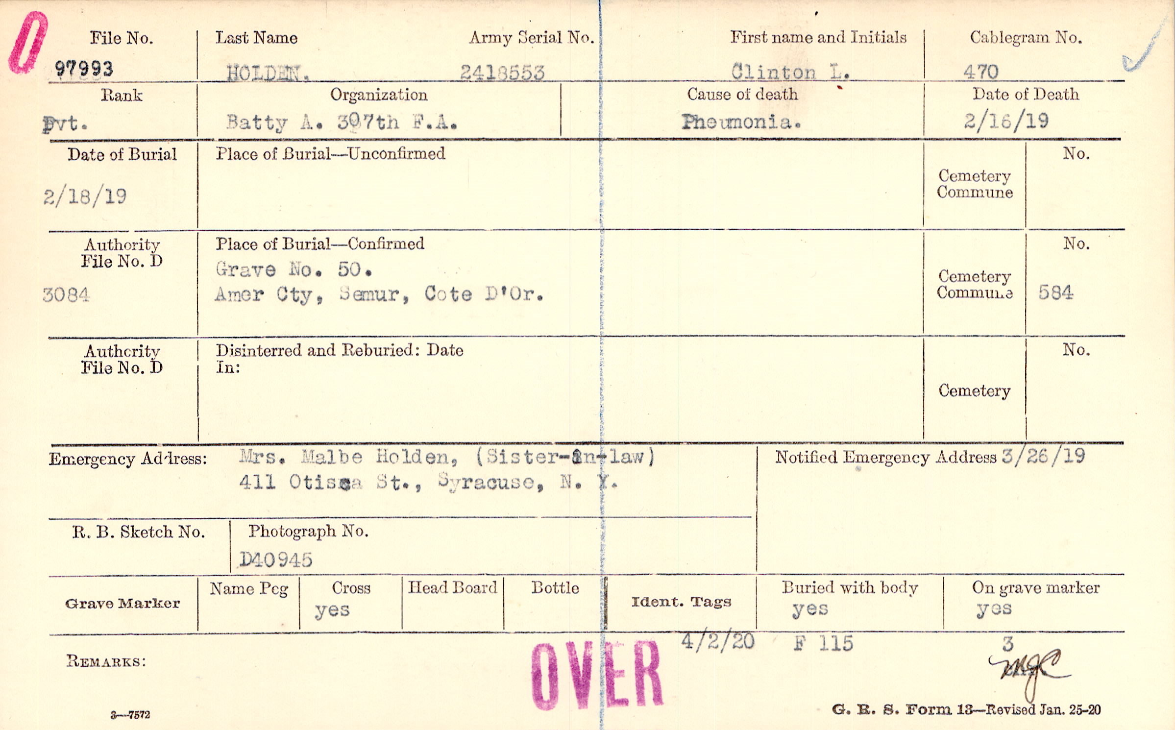 Mrs. Malbe Holden, (Sister-in-law), 411 Otisca St., Syracuse, N. Y.