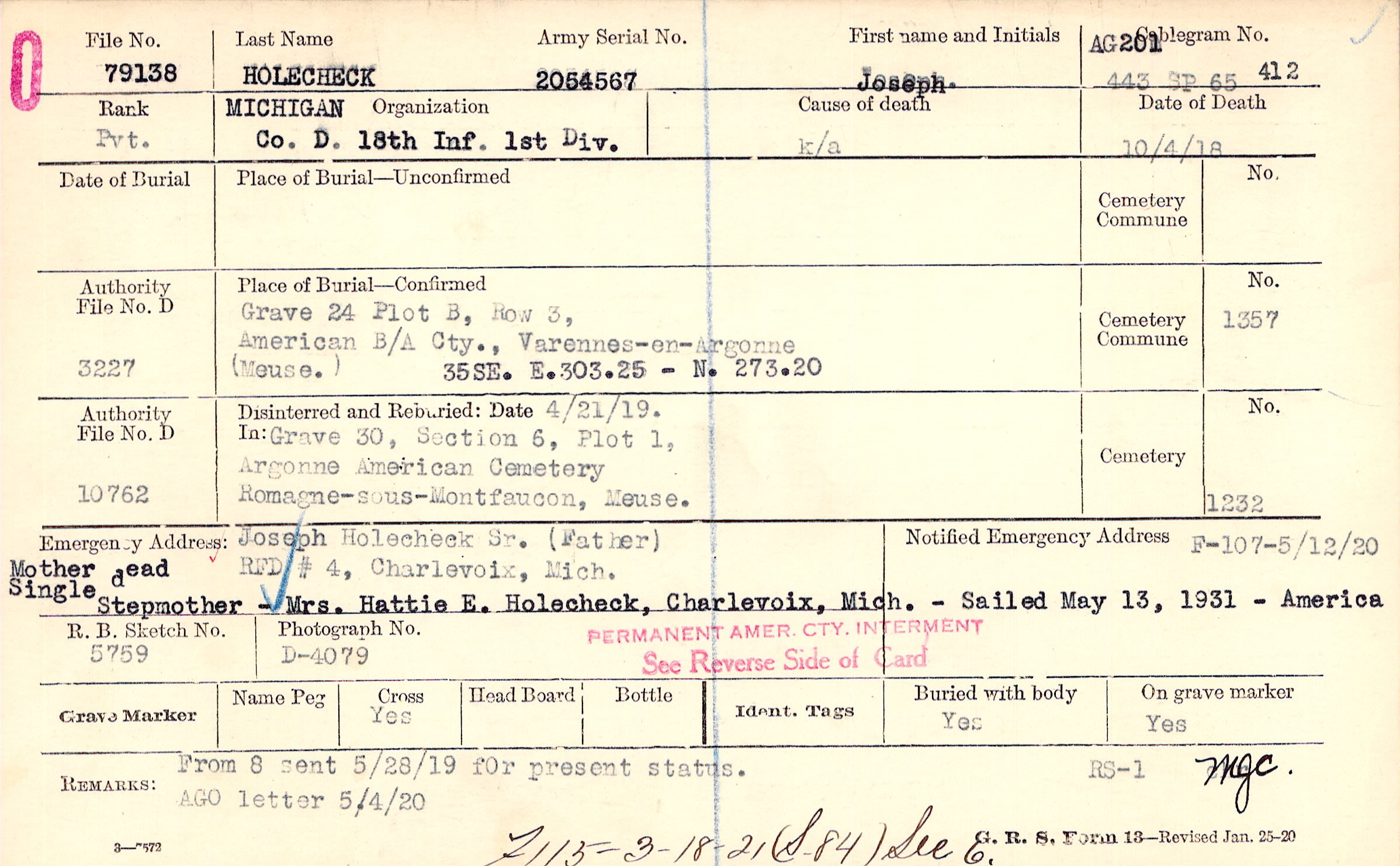 Joseph Holecheck Sr. (Father), RFD #4, Charlevoix, Mich., Mother dead Single Stepmother - Mrs. Hattie E. Holecheck, Charlevoix, Mich. - Sailed May 13, 1931 - America