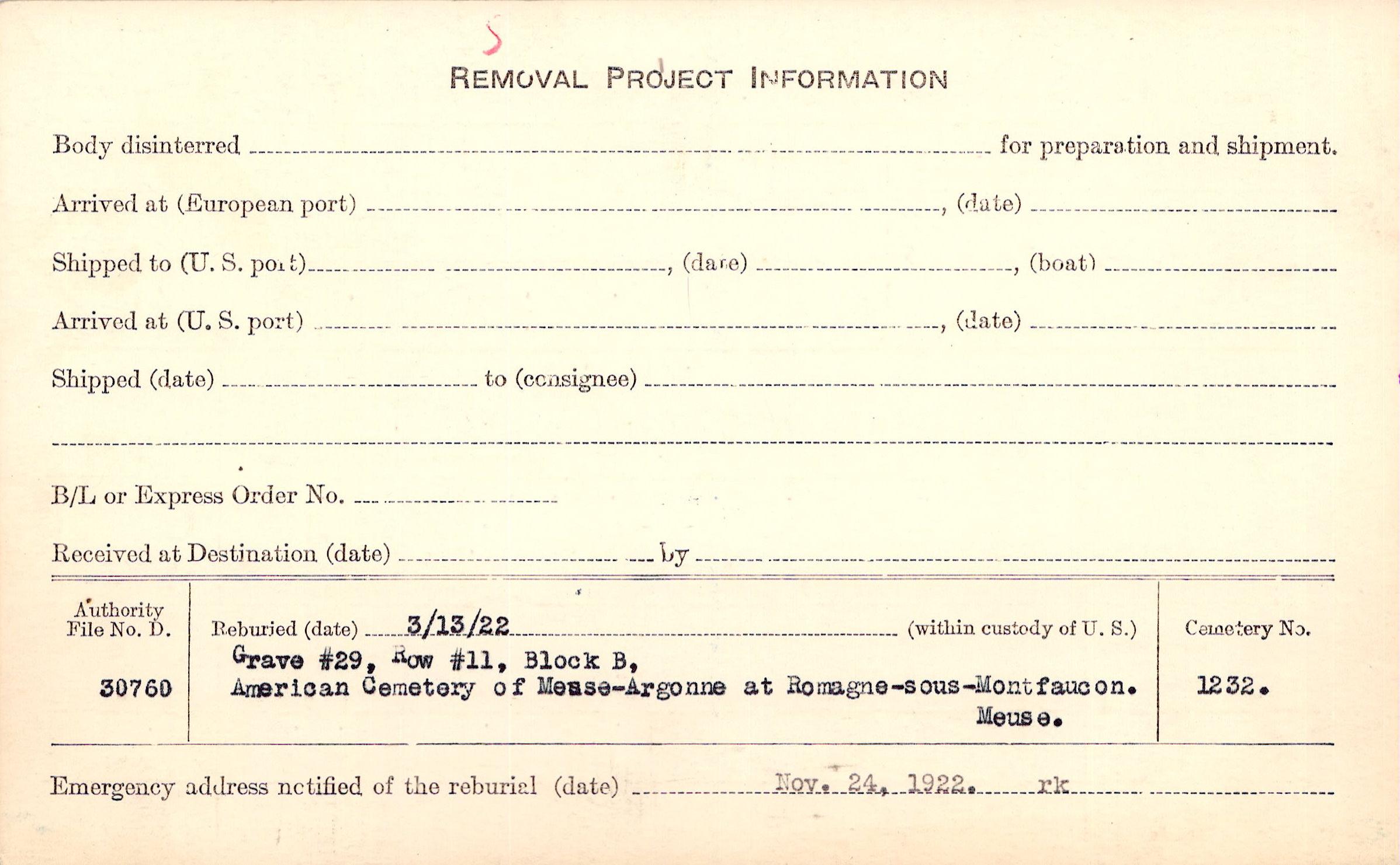 Grave 24, Plot B, Row 3, American B/A Cty., Varennes-en-Argonne, (Meuse.), 35SE