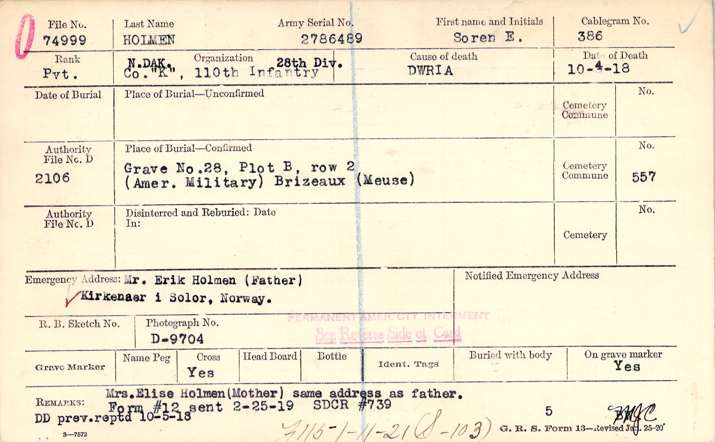 Mrs. Elise Holman (Mother) same address as father DD prev. reptd 10-5-18, 2/25/1919, 1/11/1921, #739