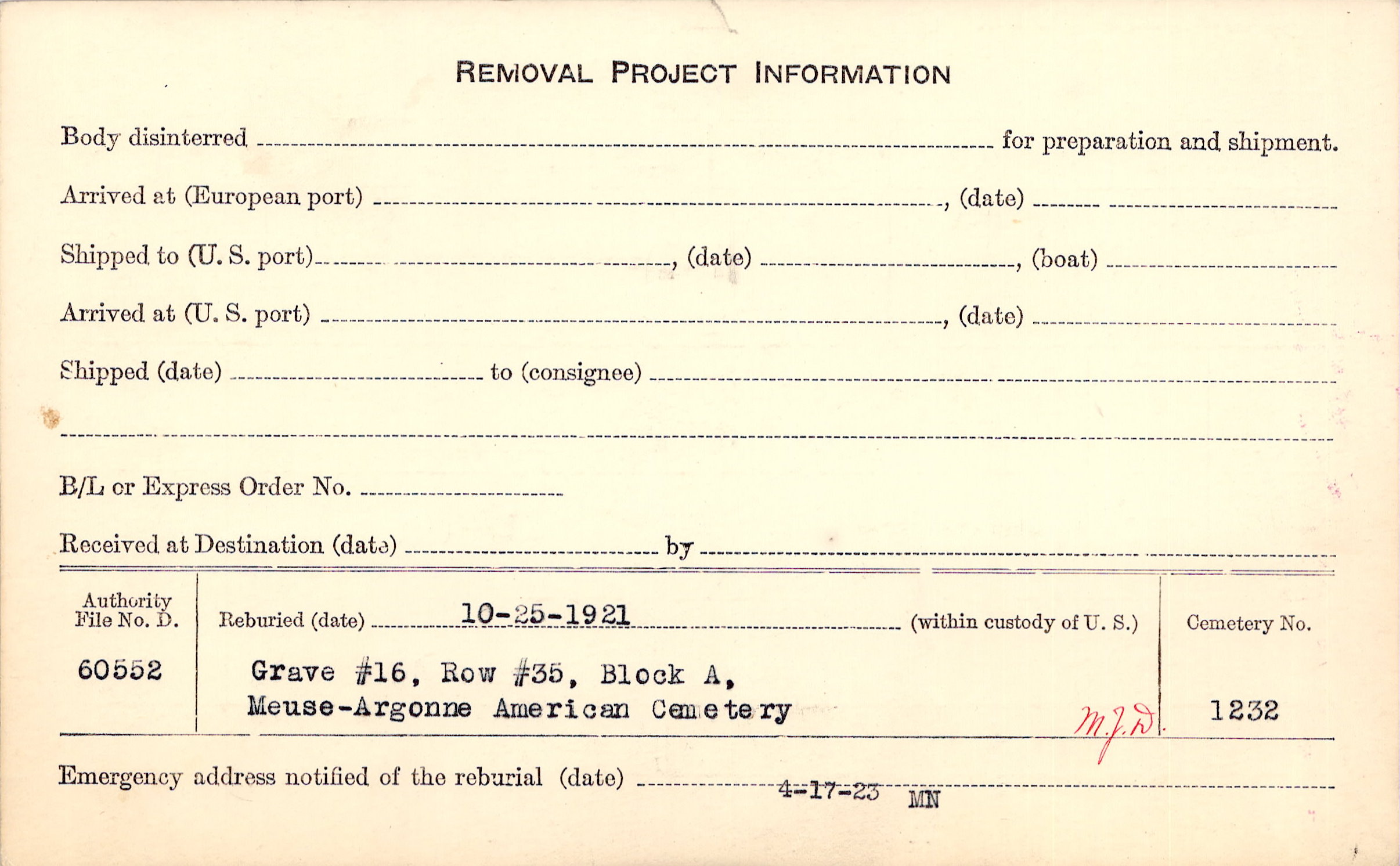 | Permanent Burial in Foreign Cemetery |