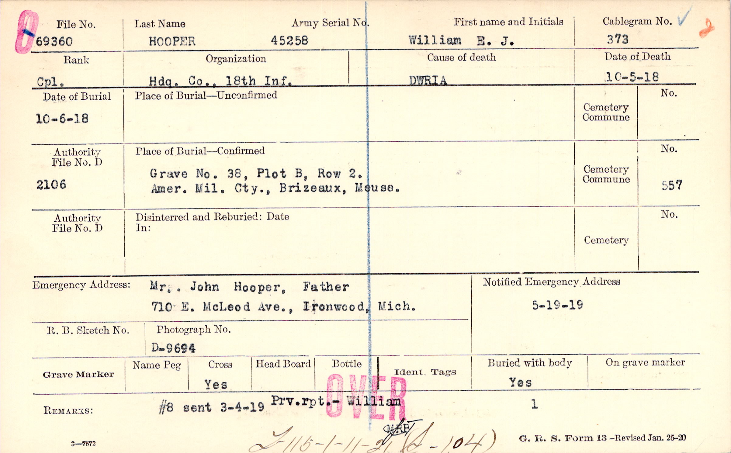 Mr. John Hooper, Father, 710 E. McLeod Ave., Ironwood, Mich.