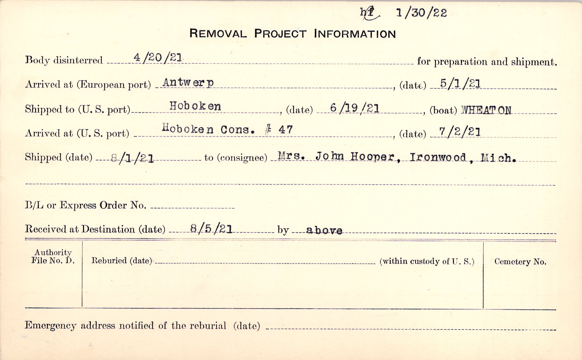 Body disinterred 4/20/1921 for preparation and shipment.