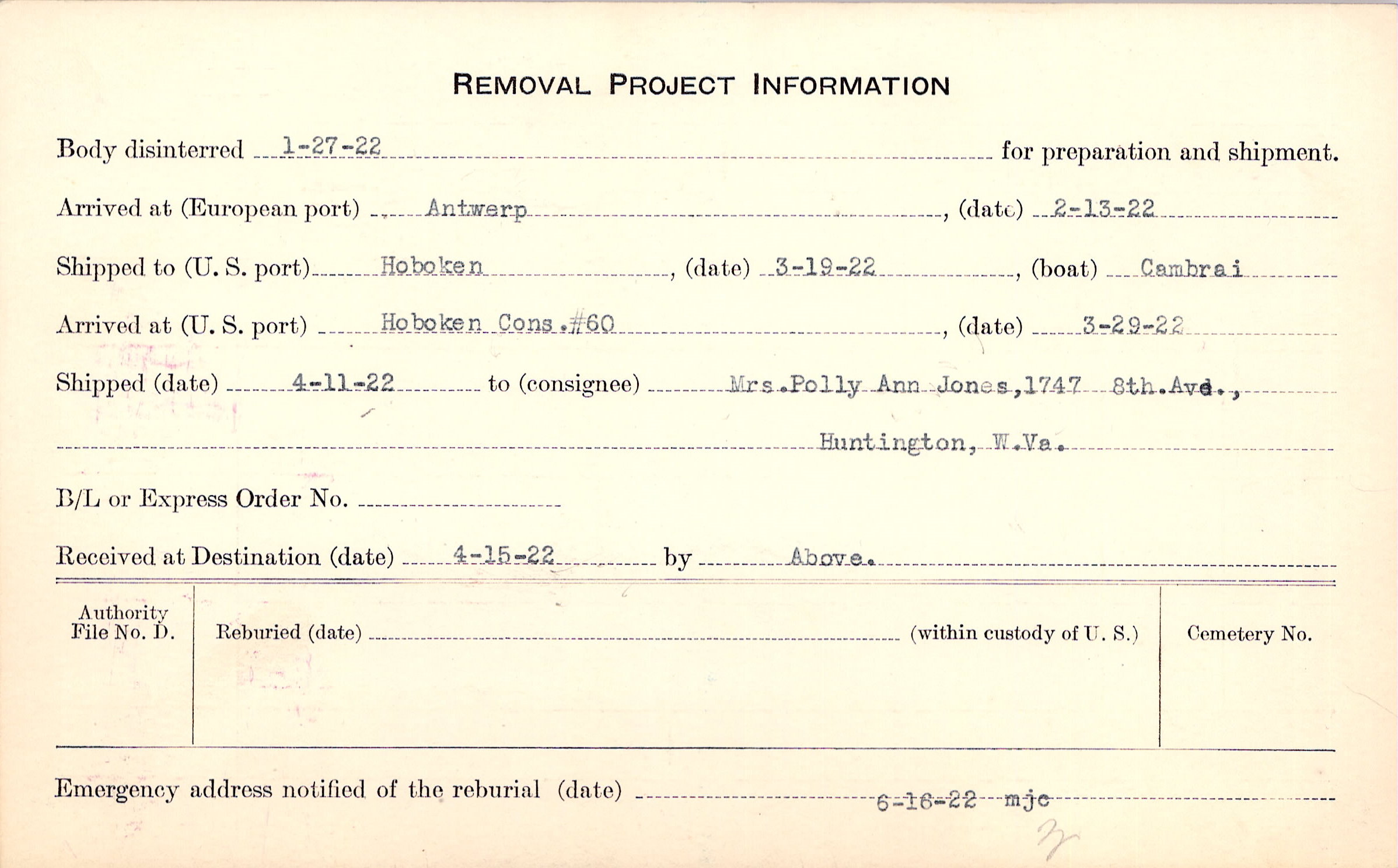 to Mrs. Polly Ann Jones, 1747 8th. Ave., Huntington, W. Va.