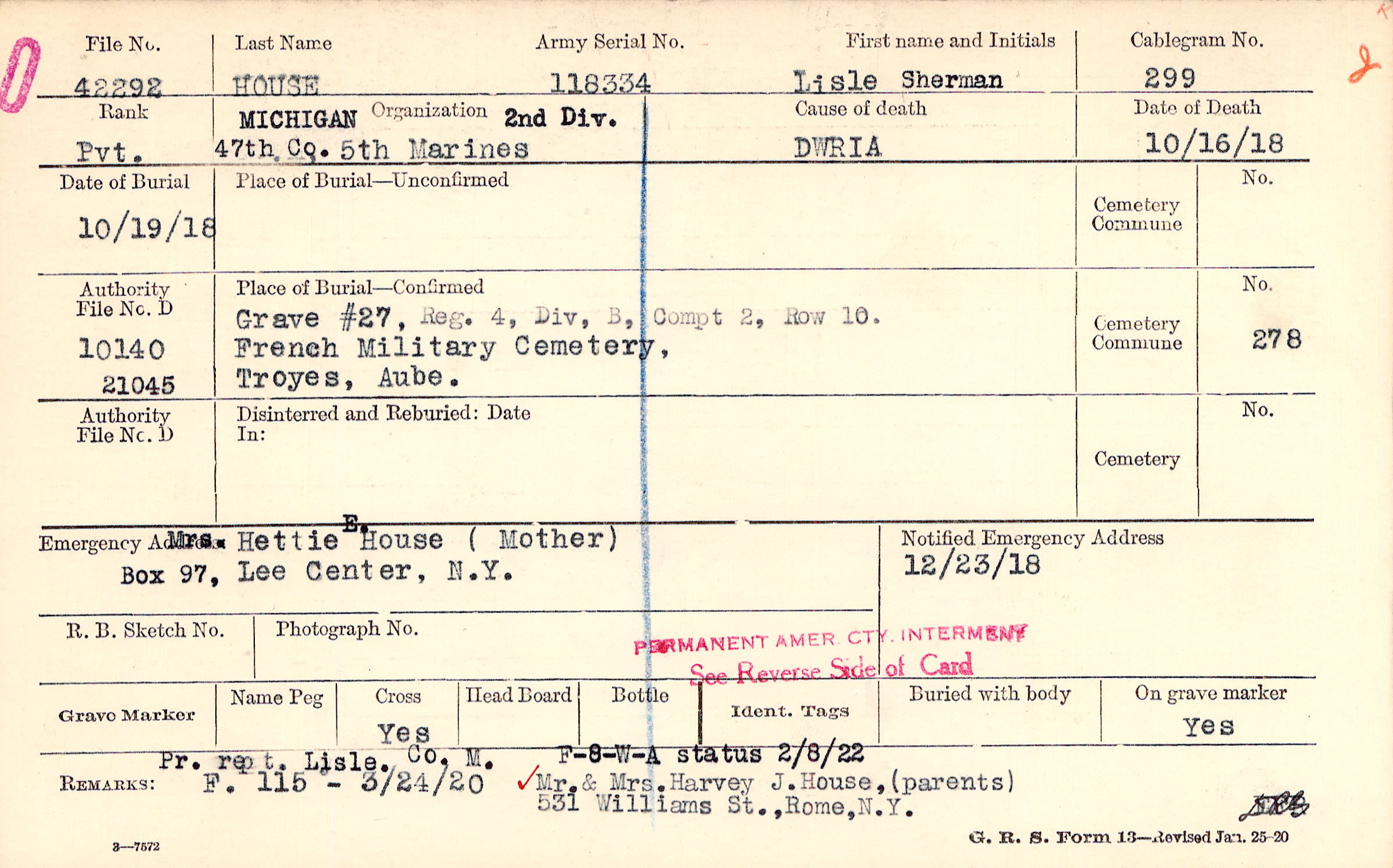 Pr. rept. , Lisle. Co. M Mr. & Mrs. Harvey J. House, 531 Williams St., Rome, N.Y., F-8-W-A status 2/8/22, F. 115 - 3/24/20