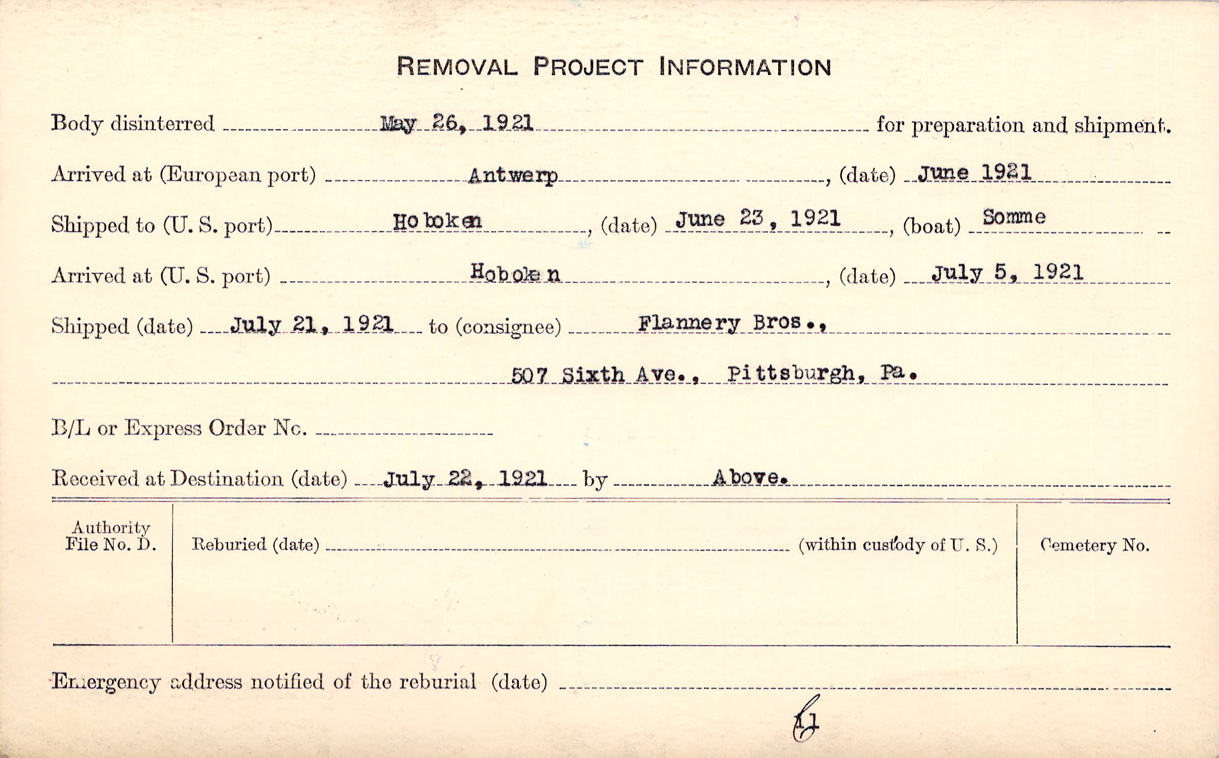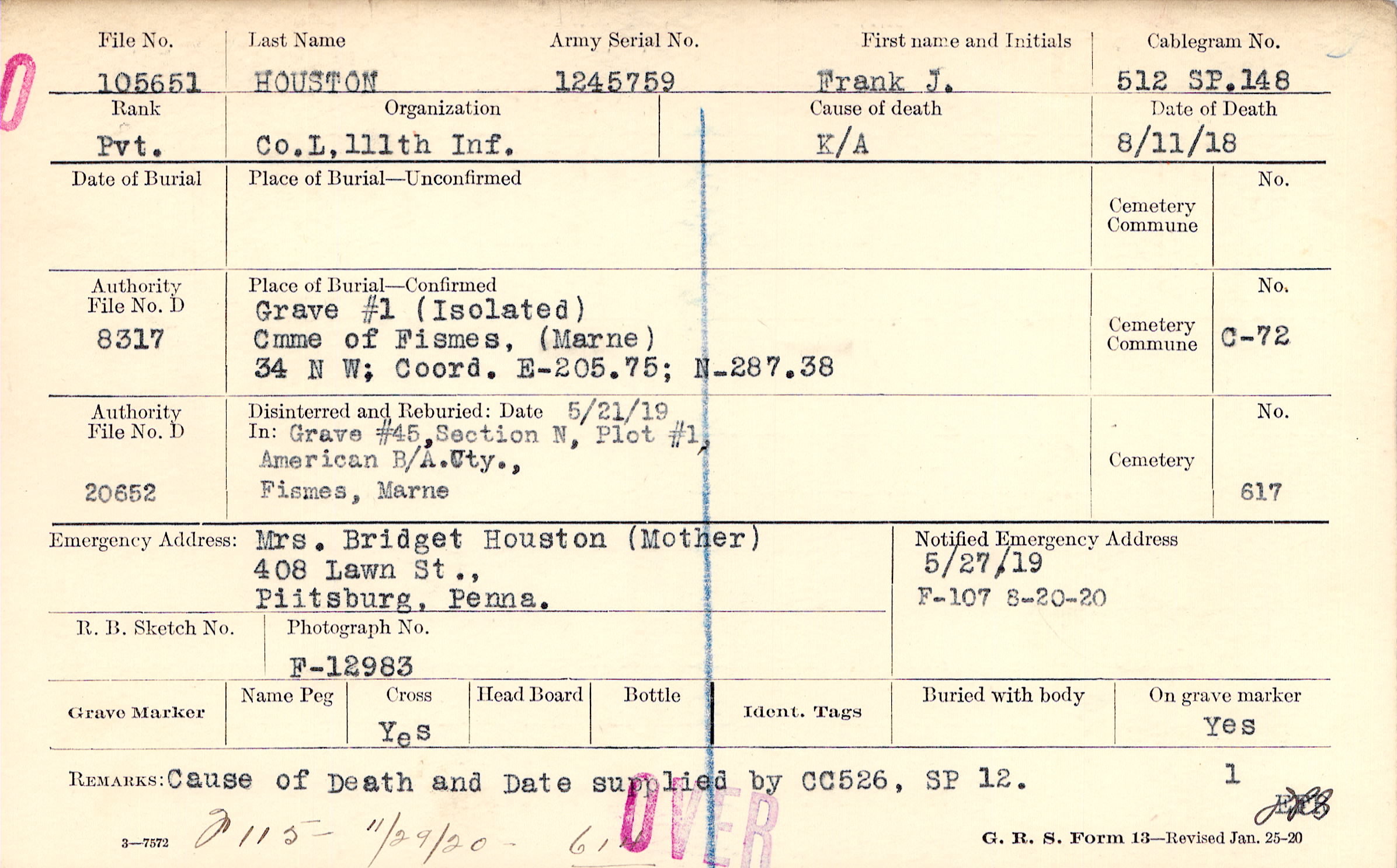 Mrs. Bridget Houston (Mother), 408 Lawn St., Piitsburg, Penna.