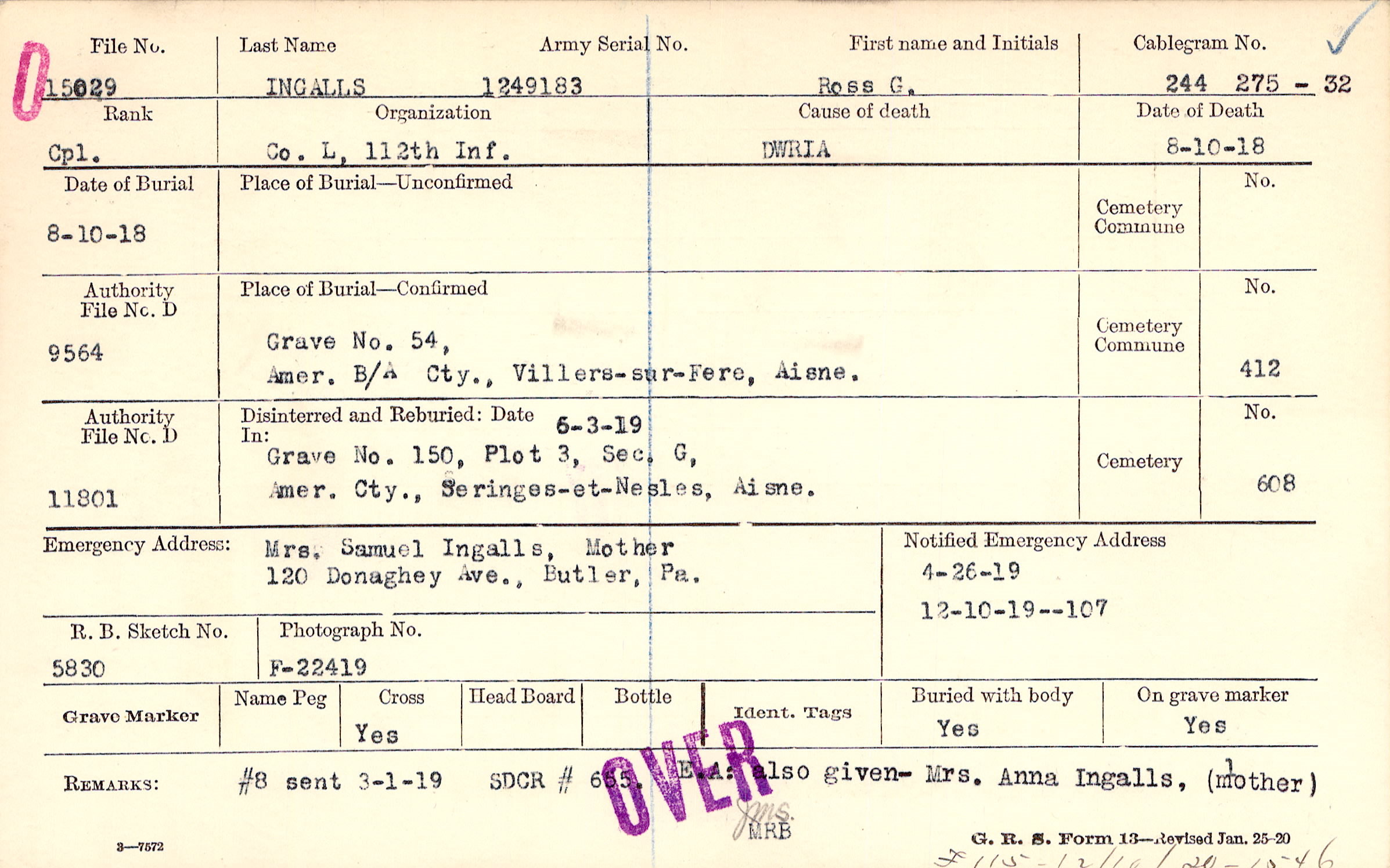 E.A: also given- Mrs. Anna Ingalls, (mother), #8 sent 3-1-19, F115 - 12/10/20 - 1546, SDCR #655