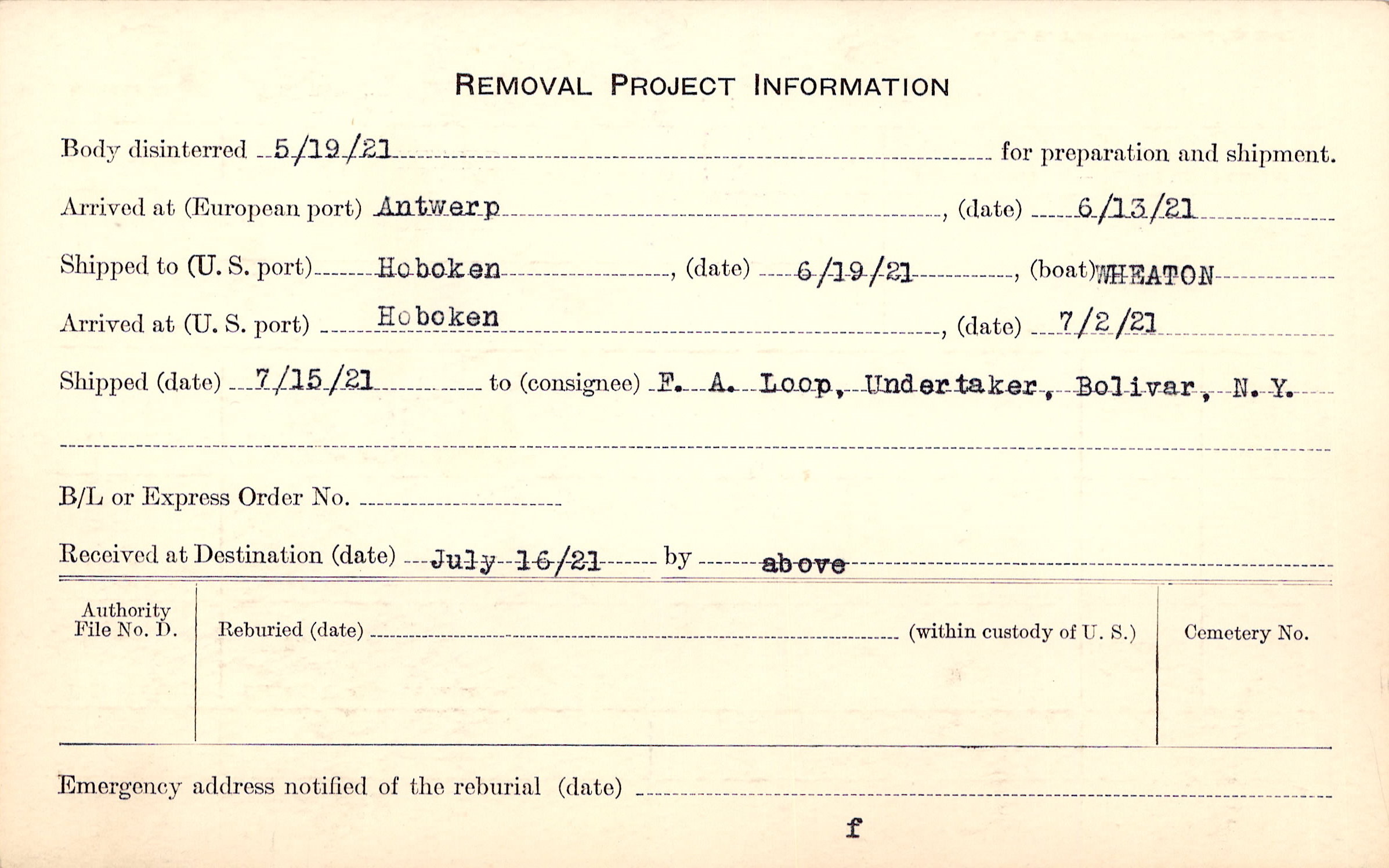 to F. A. Loop, Undertaker, Bolivar, N. Y.
