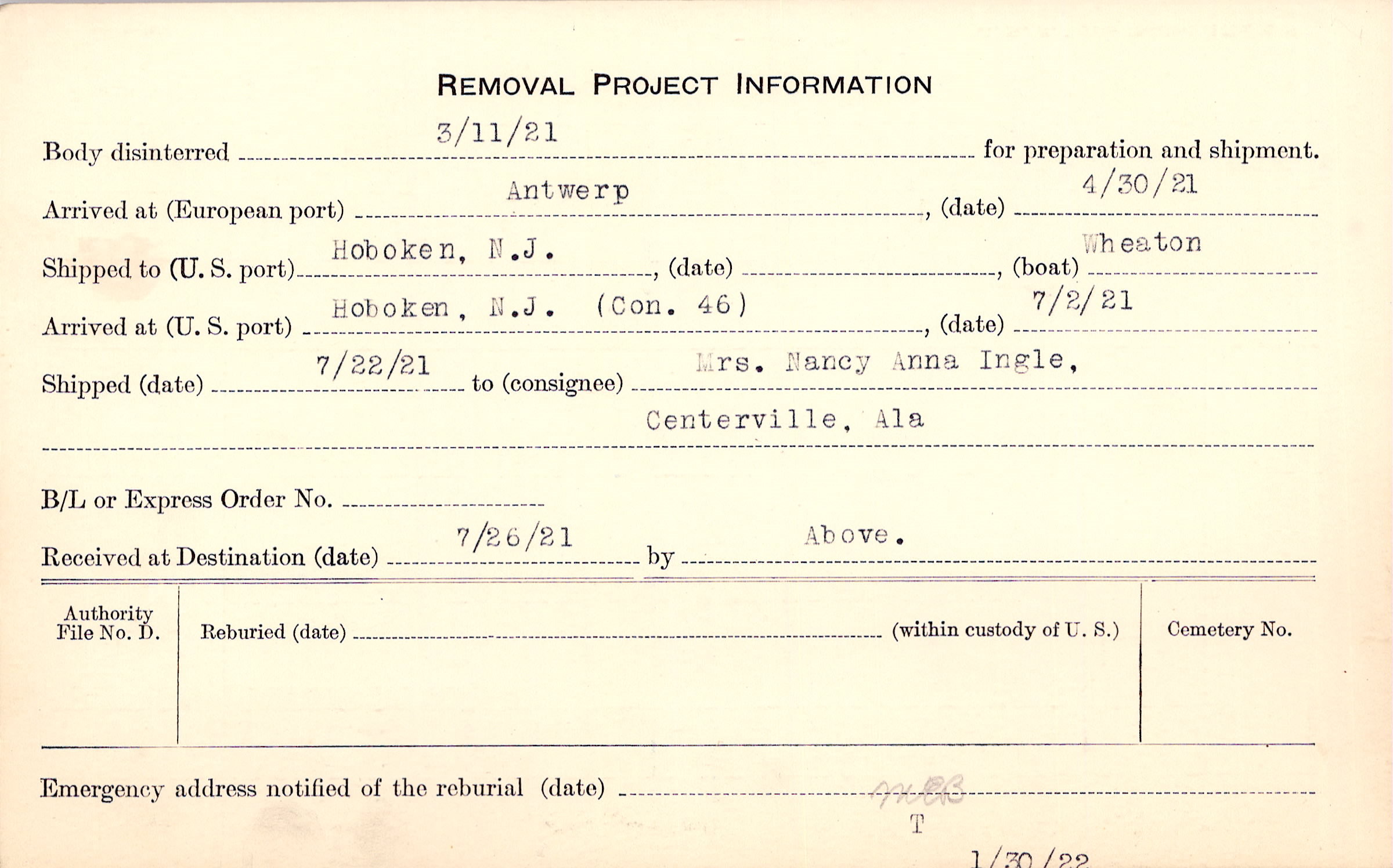 Body disinterred 3/11/1921 for preparation and shipment.