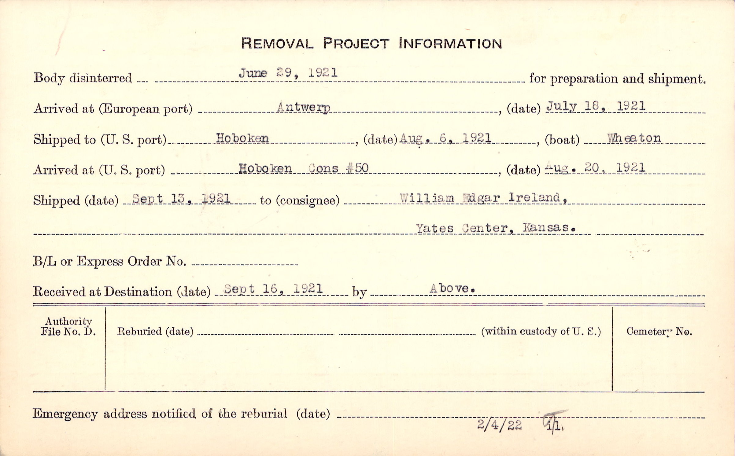 Body disinterred 6/29/1921 for preparation and shipment.