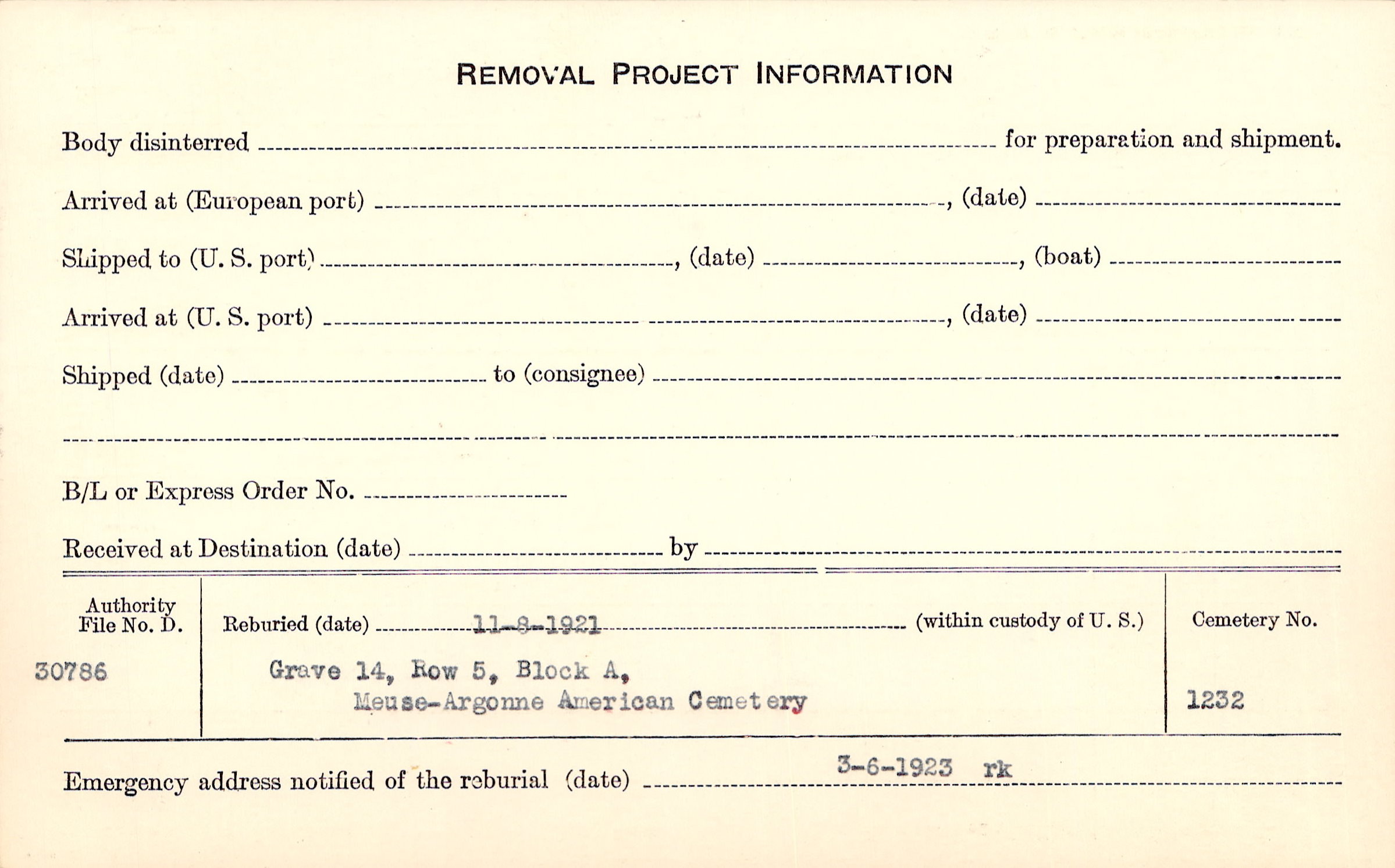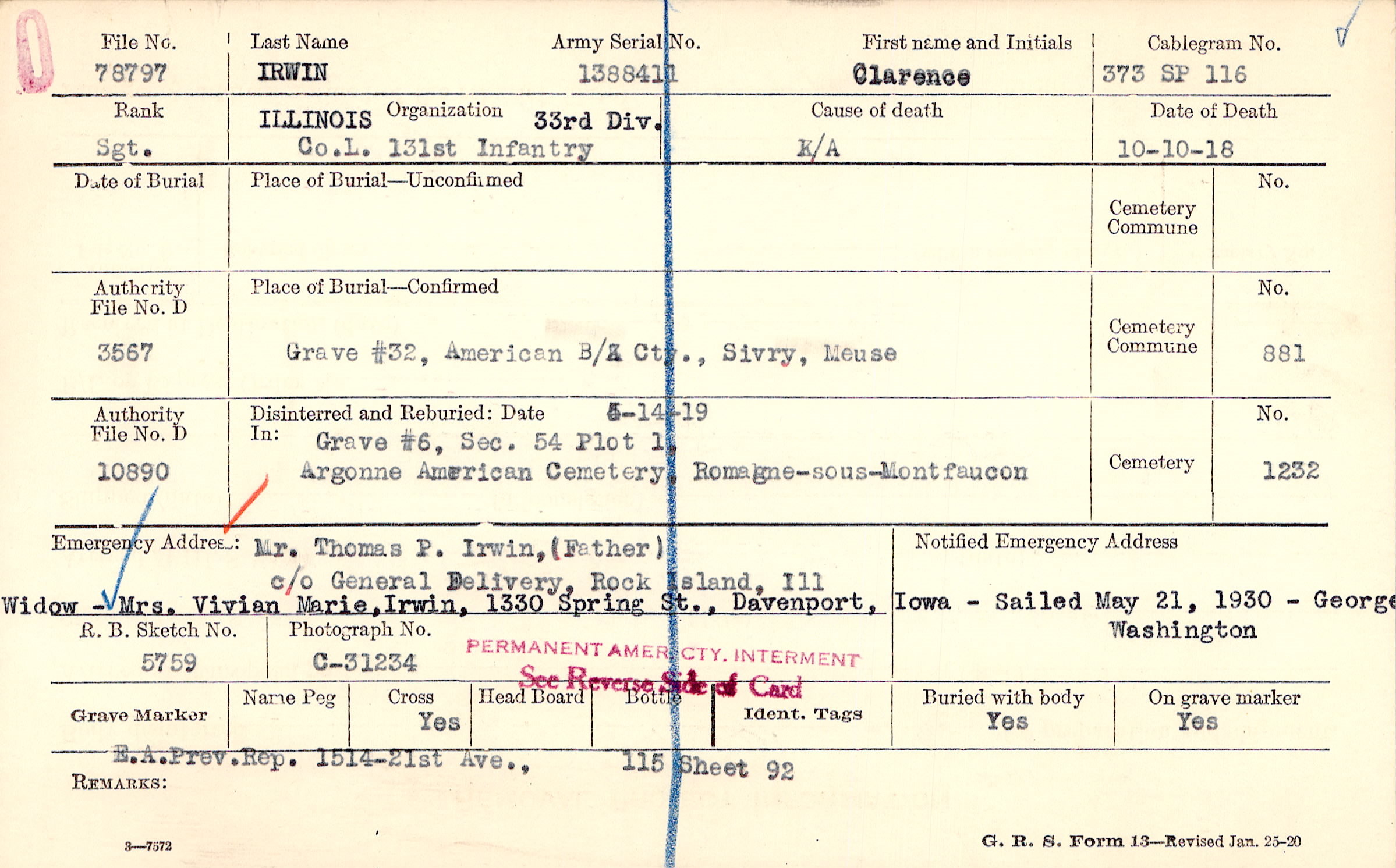 Mr. Thomas P. Irwin, (Father), c/o General Delivery, Rock Island, Ill., Widow - Mrs. Vivian Marie, Irwin, 1330 Spring St., Davenport, Iowa - Sailed May 21, 1930 - George Washington Permanent Amer. Cty. Interment See Reverse Side of Card