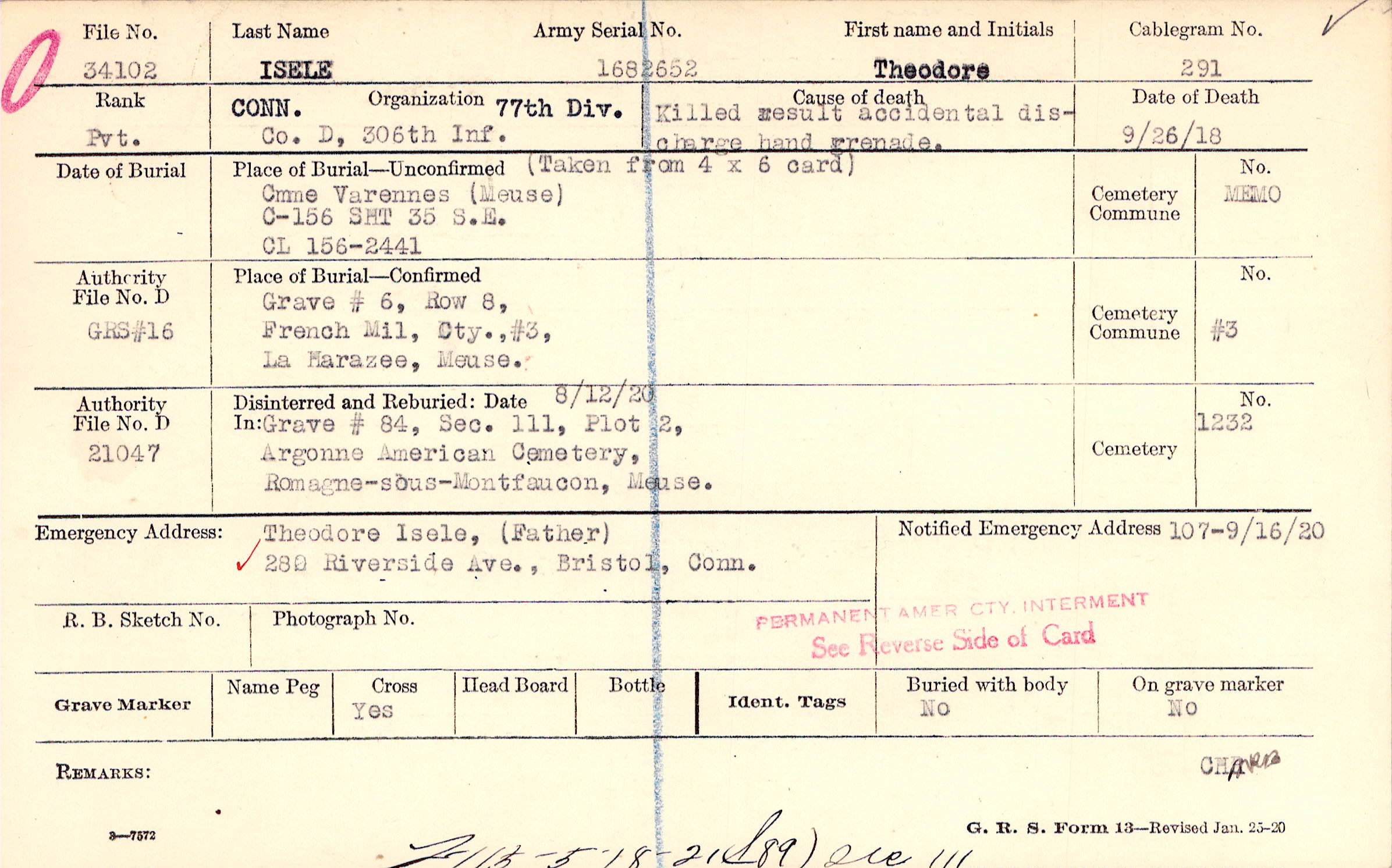 Theodore Isele, (Father), 280 Riverside Ave., Bristol, Conn., F115 - 5/18/21 (89) Sec 111