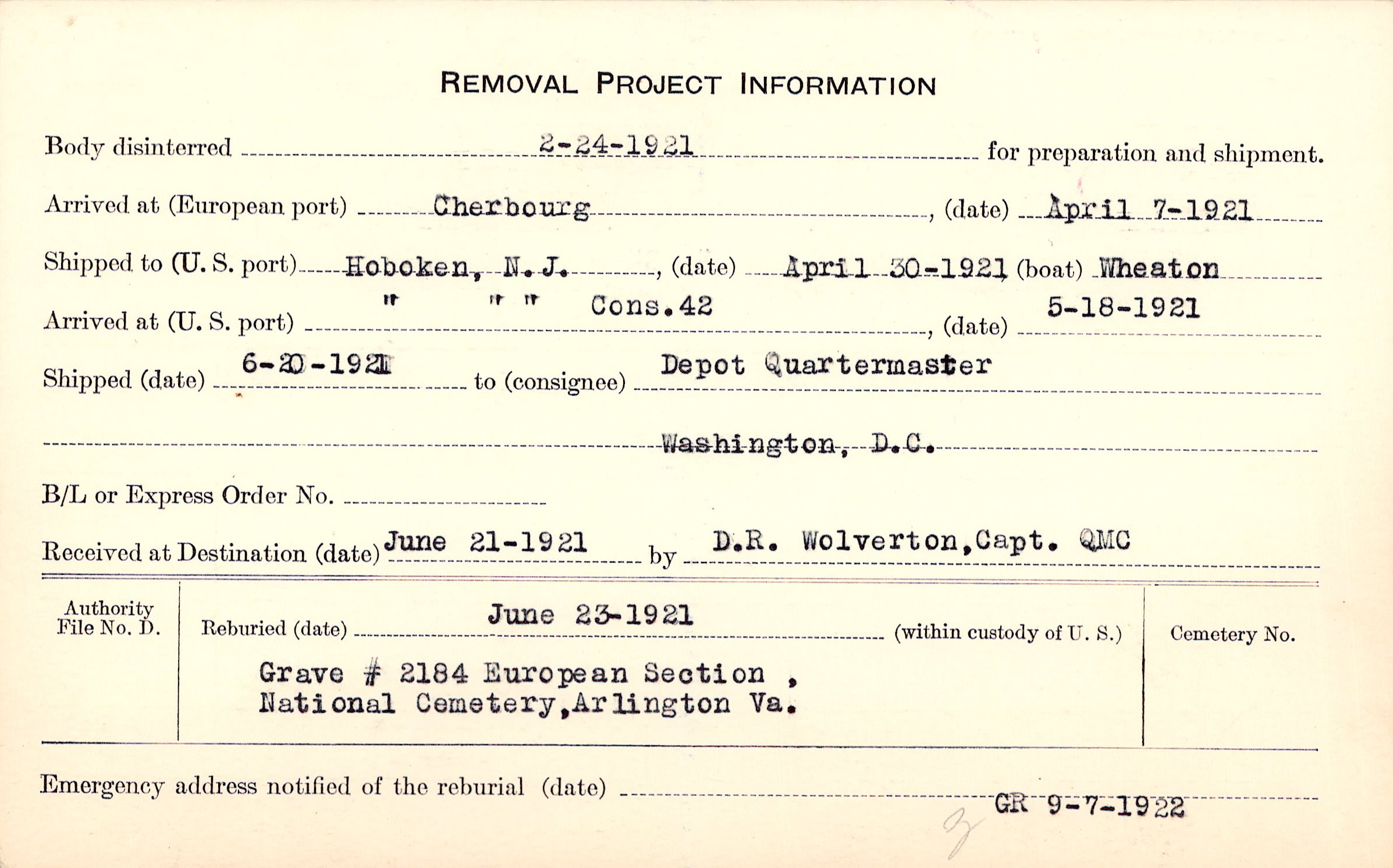 Body disinterred 2/24/1921 for preparation and shipment.