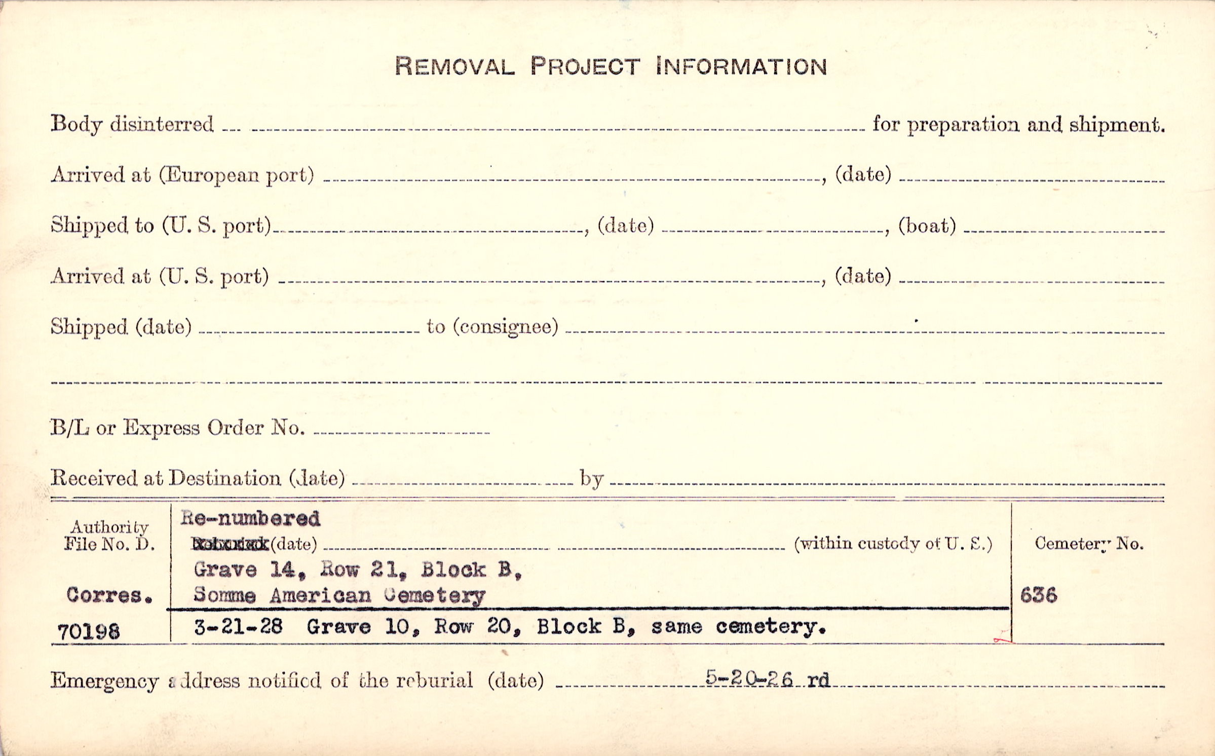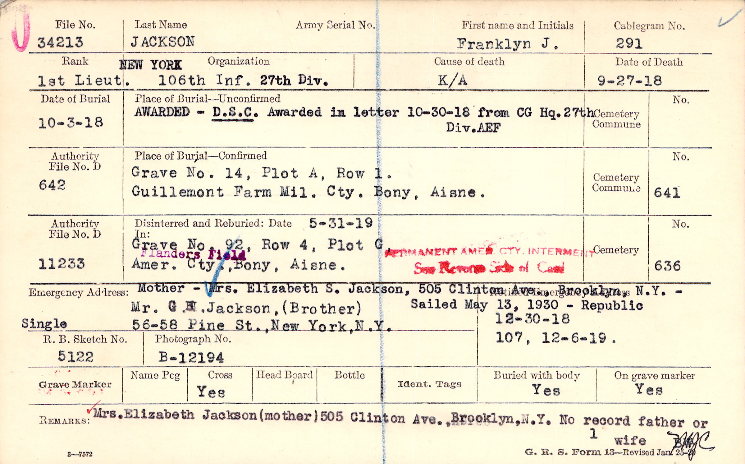 Awarded D.S.C., awarded in letter 10-30-18 from CG Hq. 27th Div. AEF
