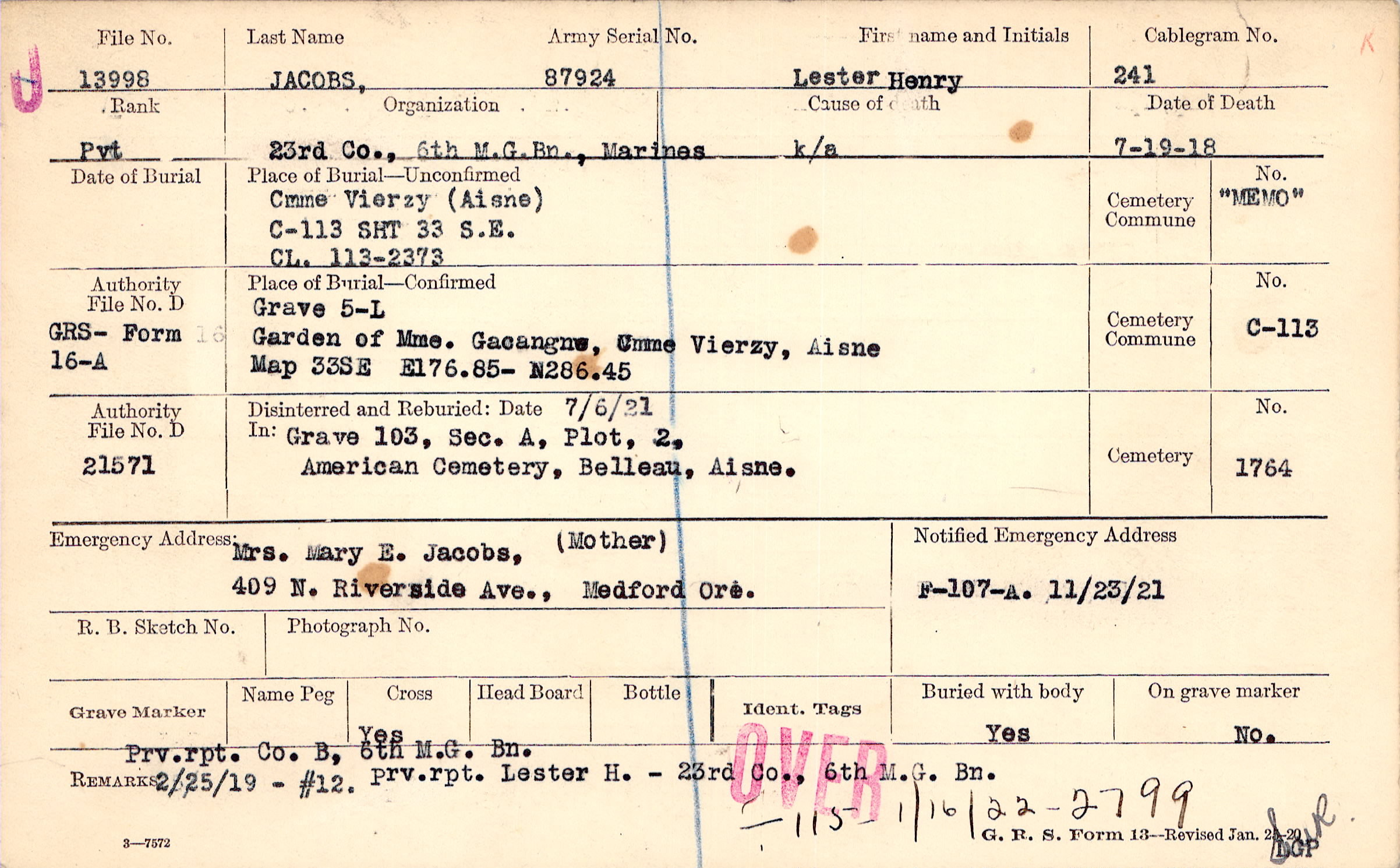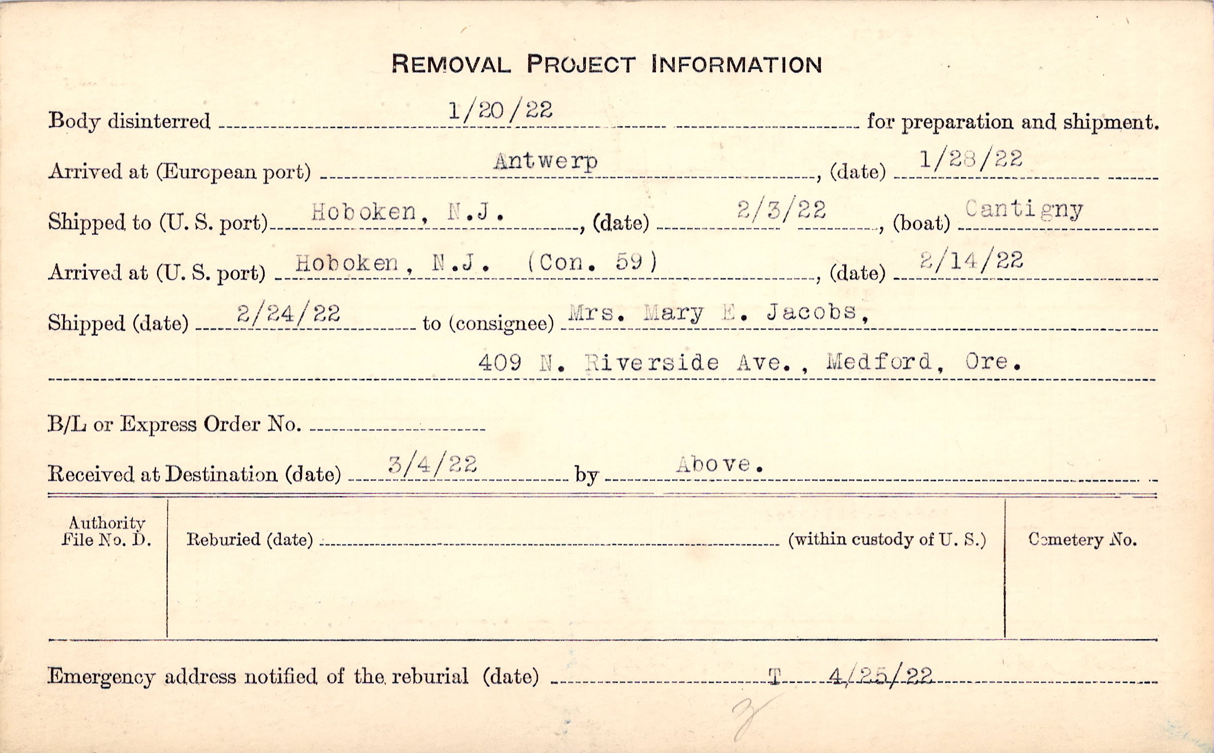 Mrs. Mary E. Jacobs, (Mother), 409 N. Riverside Ave., Medford Ore.