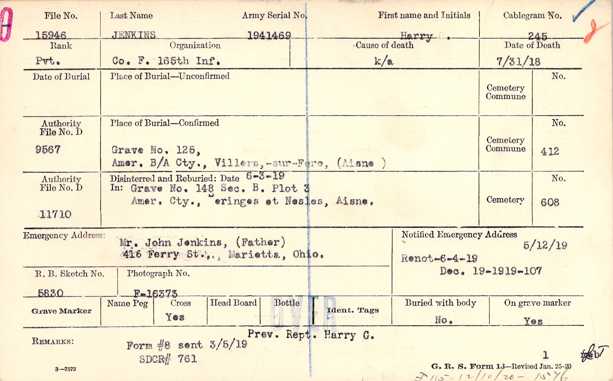 Mr. John Jenkins, (Father), 416 Ferry St., Marietta, Ohio.