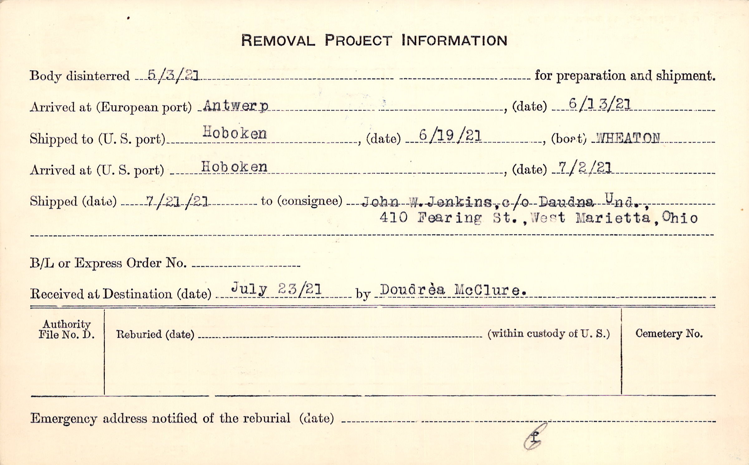 Body disinterred 5/3/1921 for preparation and shipment.
