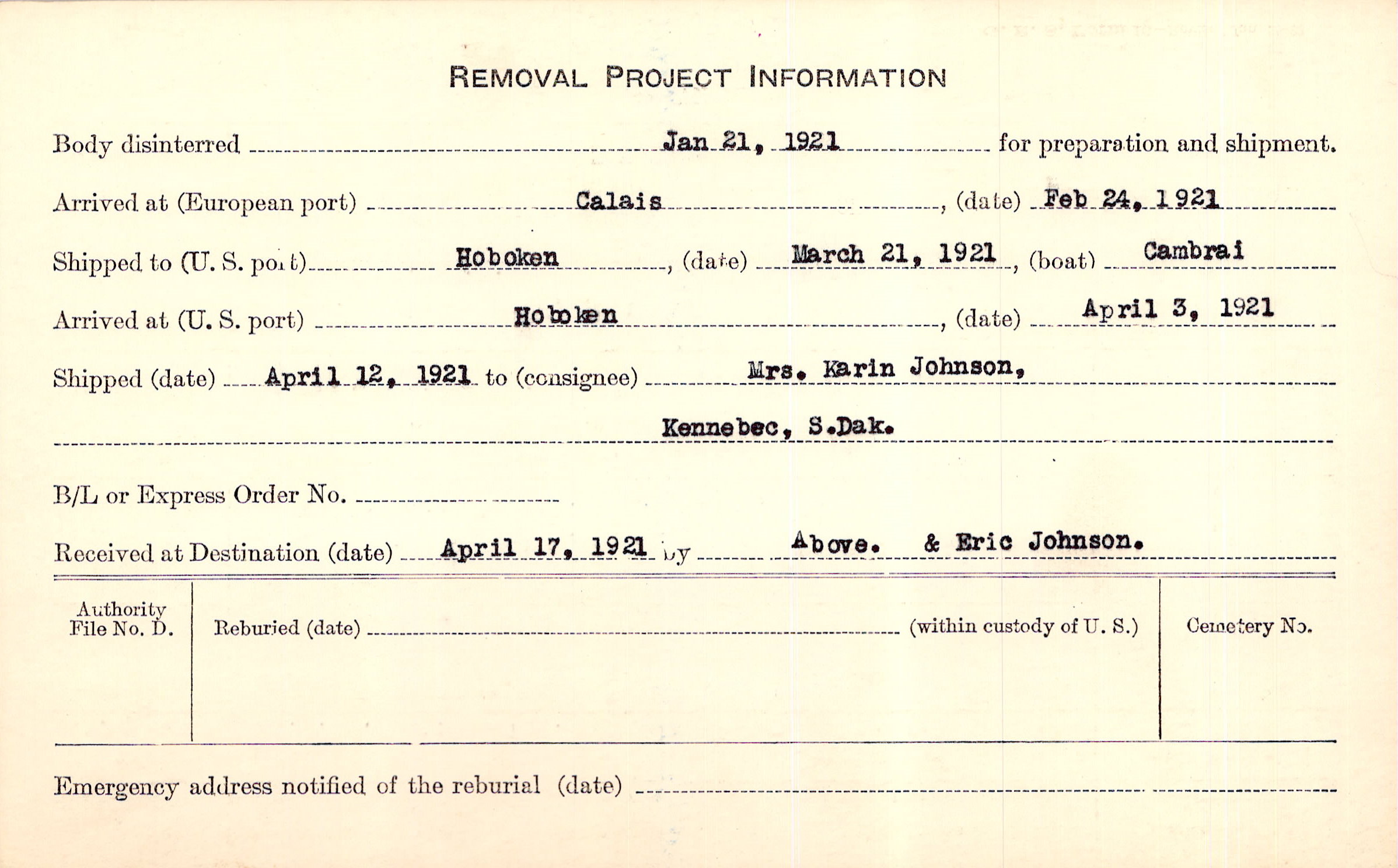 Body disinterred 1/21/1921 for preparation and shipment.