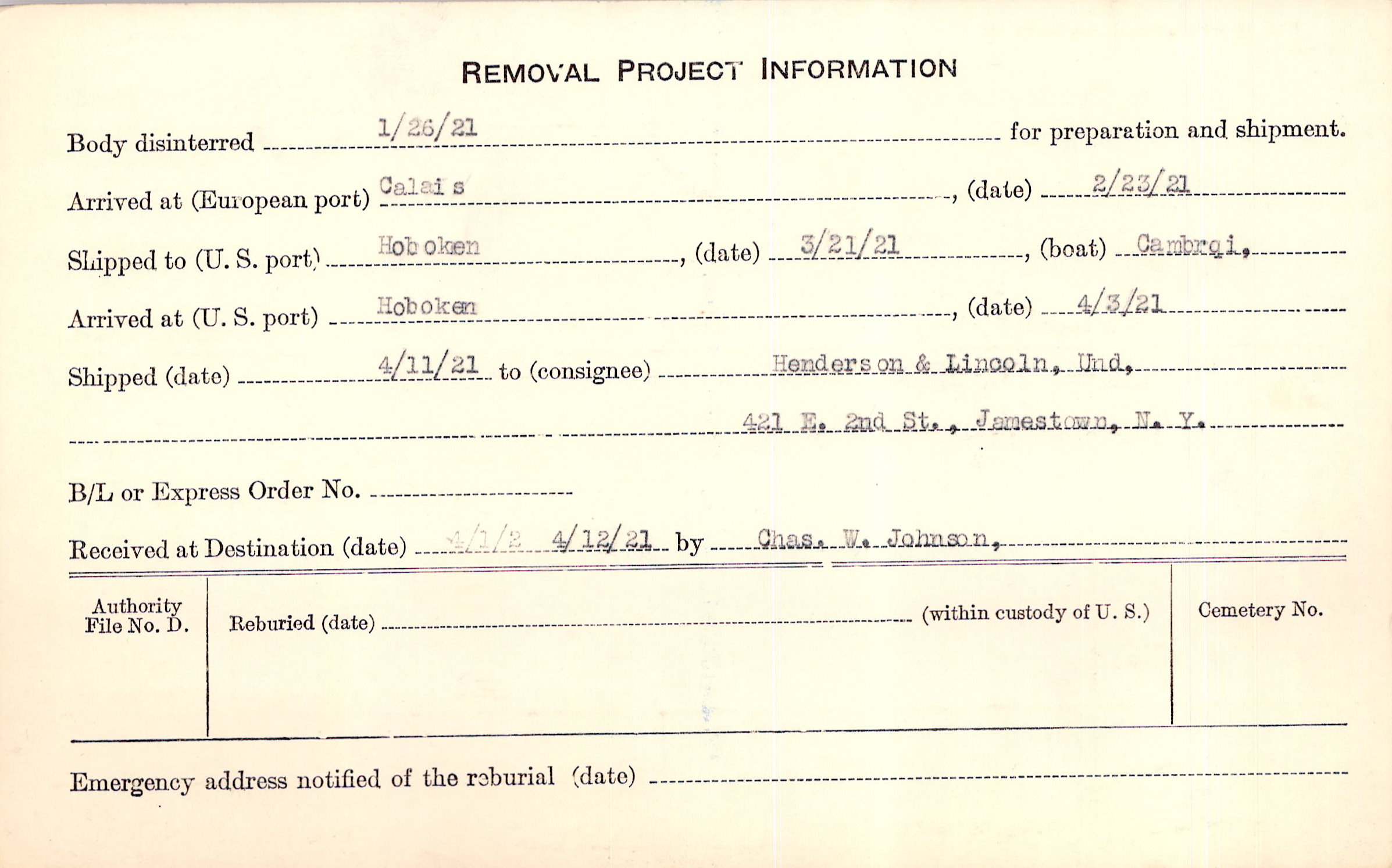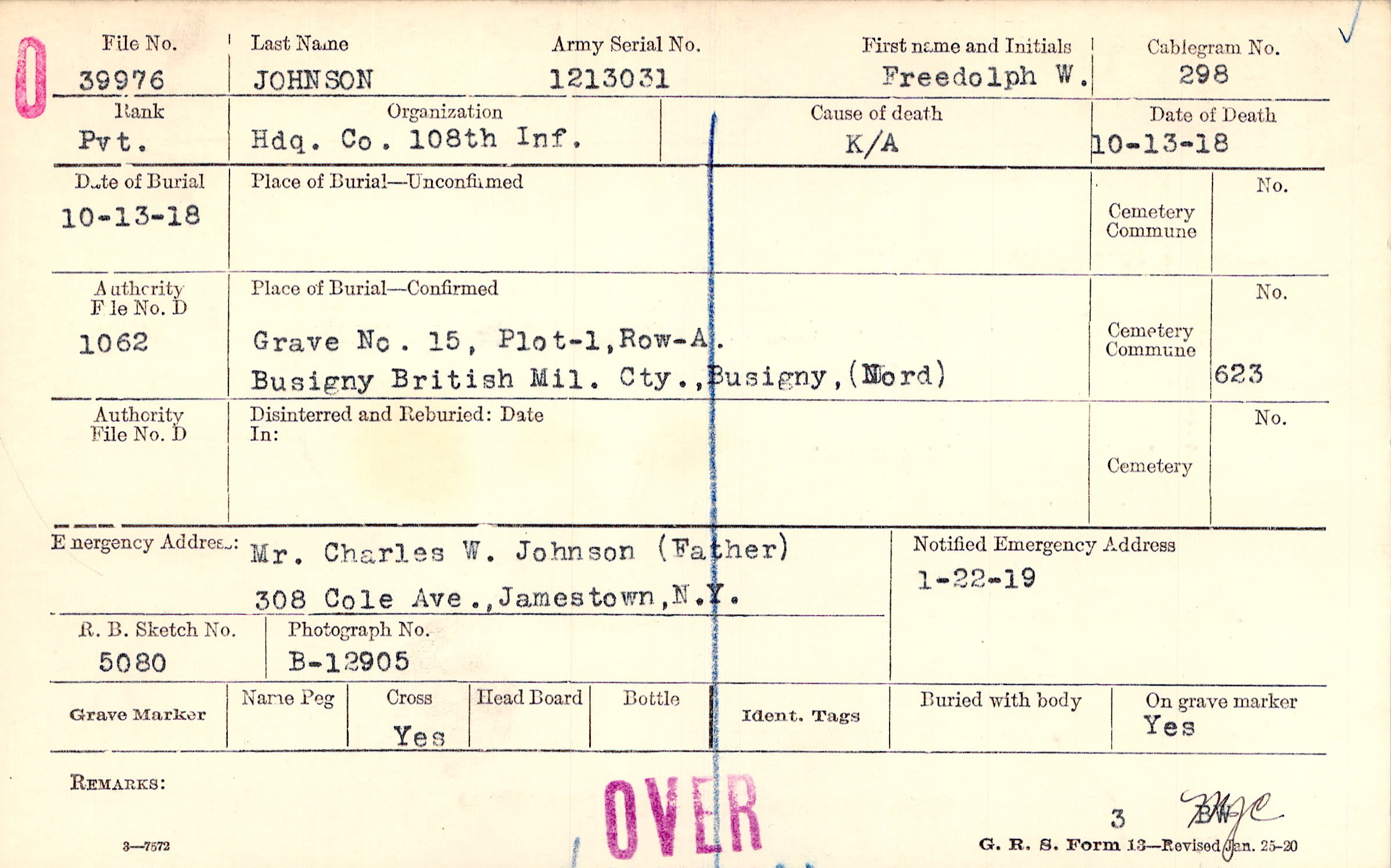 Mr. Charles W. Johnson (Father), 308 Cole Ave., Jamestown, N.y>