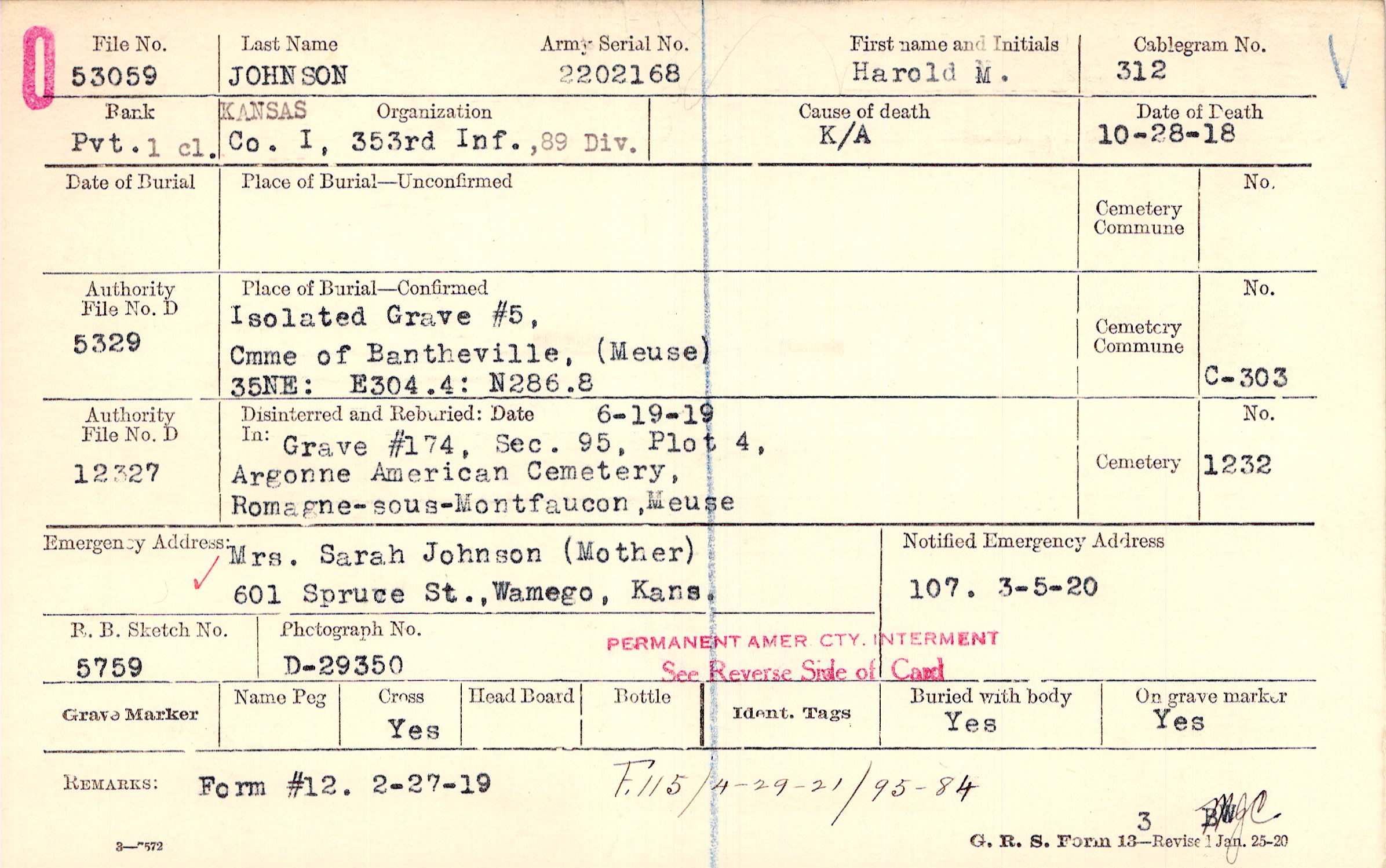 Mrs. Sarah Johnson (Mother), 601 Spruce St., Wamego, Kans.