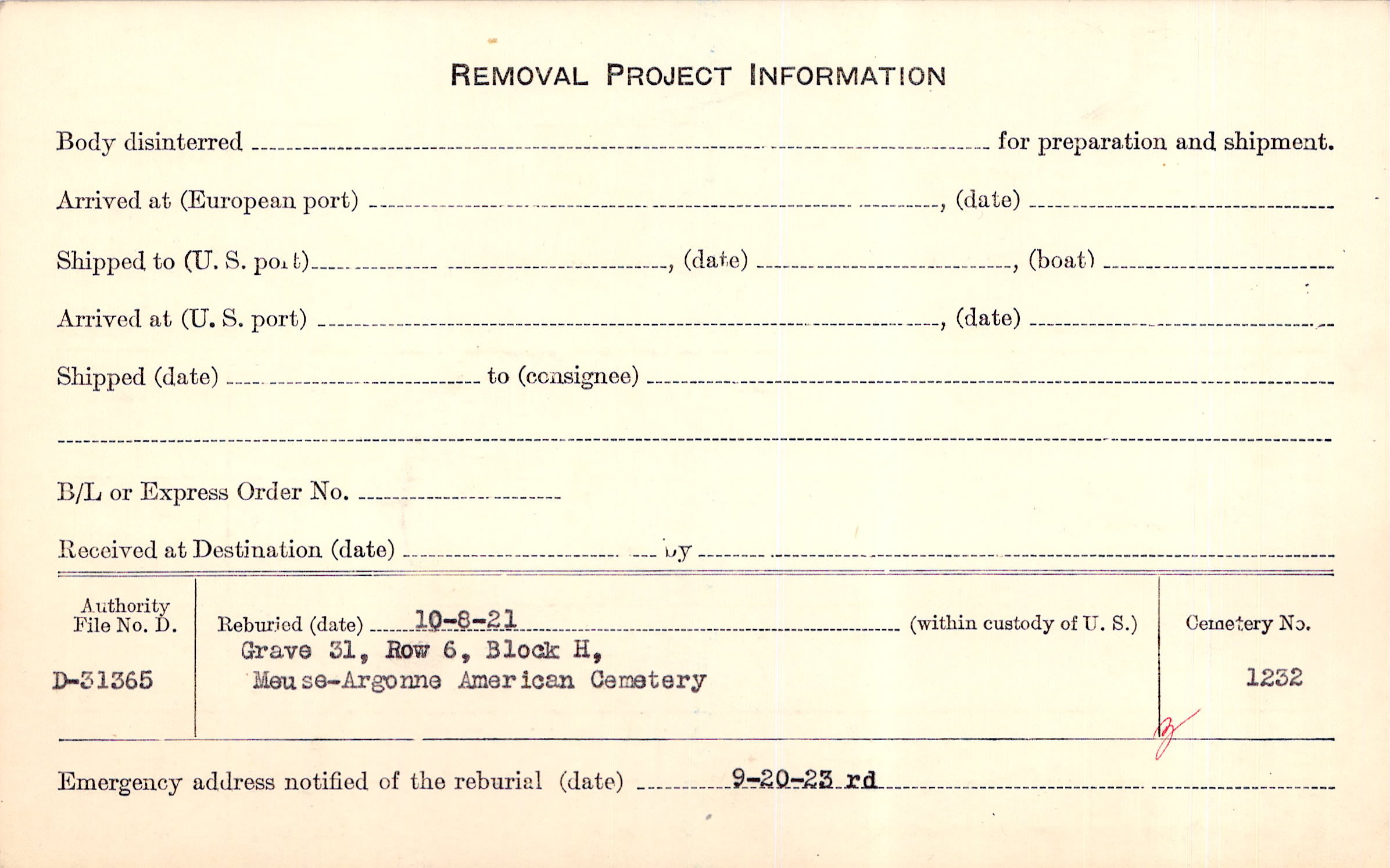 | Permanent Burial in Foreign Cemetery |