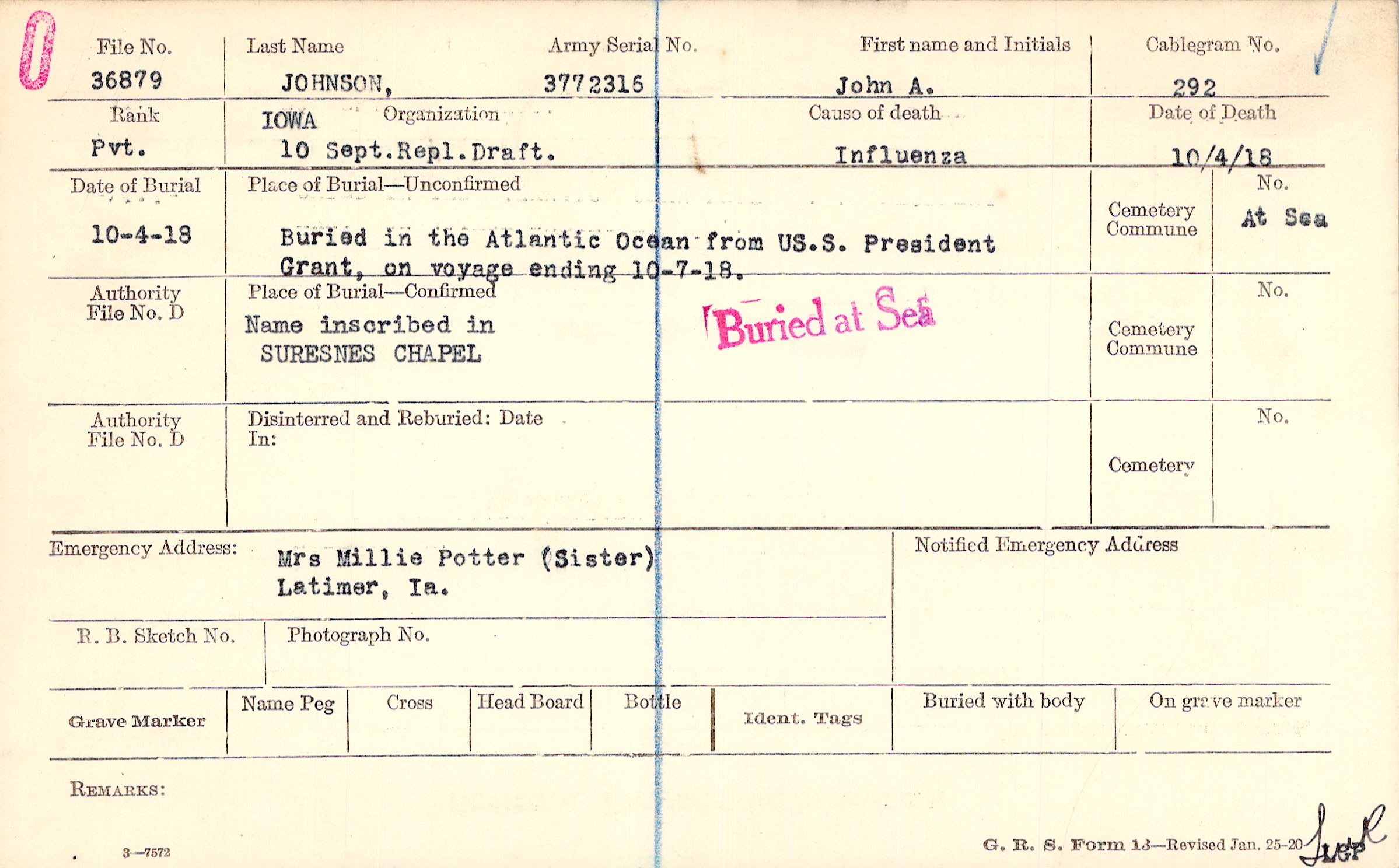 Buried in the Atlantic Ocean from US. S. President Grant, on voyage ending 10-7-18