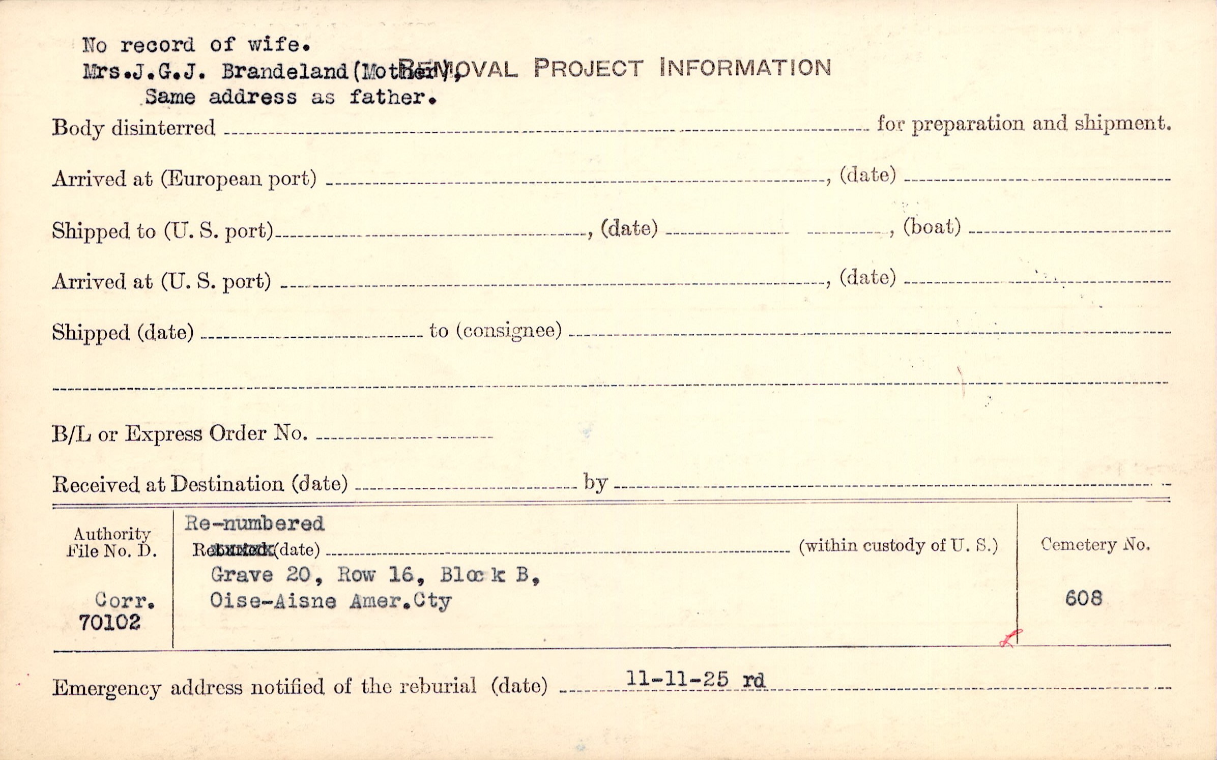 No record of wife. Mrs. J.G.J. Brandeland (Mother), Same address as father. |