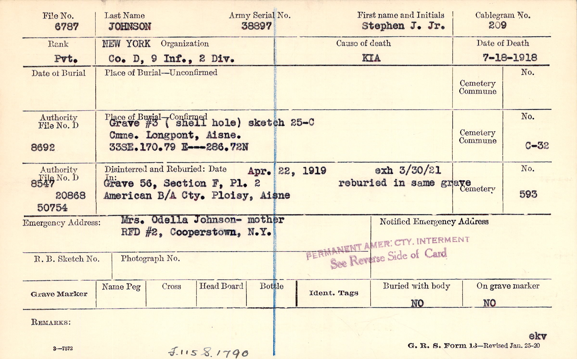 Grave 56, Section F, Plot 2, American B/A Cemetery, Ploisy, Aisne, exh 3/30/21, reburied in same grave