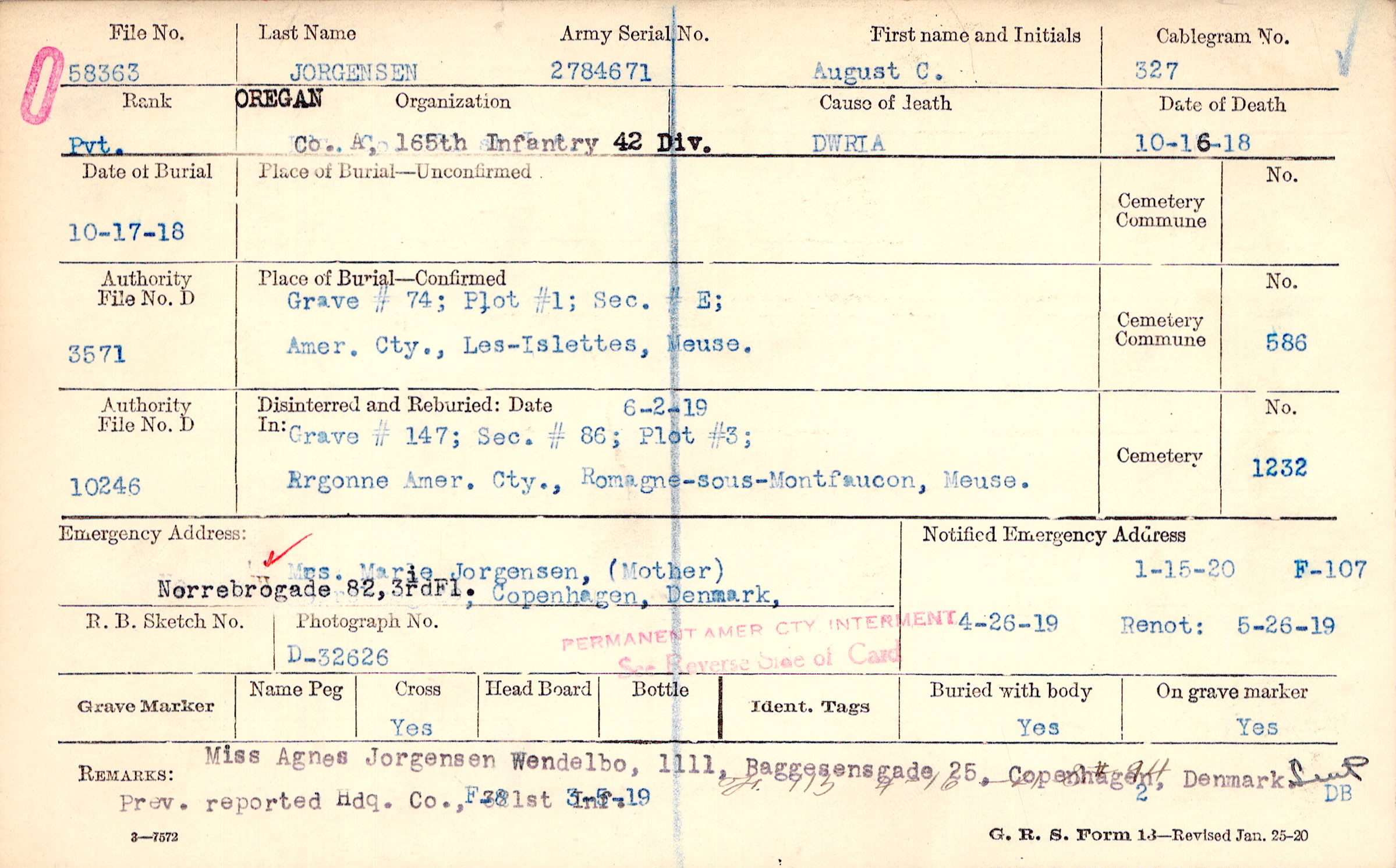 Mrs. Marie Jorgensen, (Mother), Norrebrogade 82, 3rd Fl., Copenhagen, Denmark