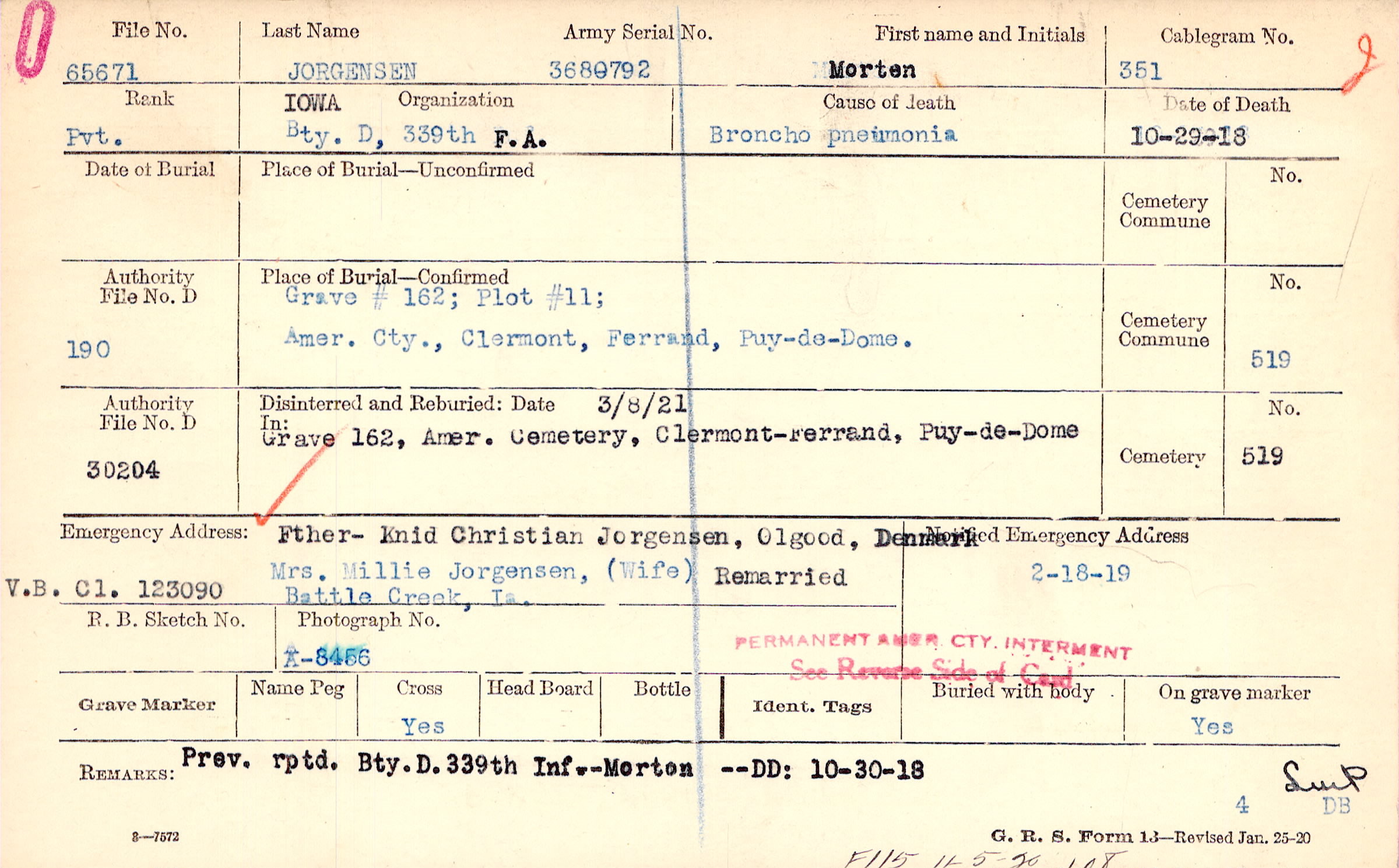 Mrs. Millie Jorgensen, (Wife), Battle Creek, Ia., Remarried Fther- Knid Christian Jorgensen, Olgood, Denmark V.B. Cl. 123090