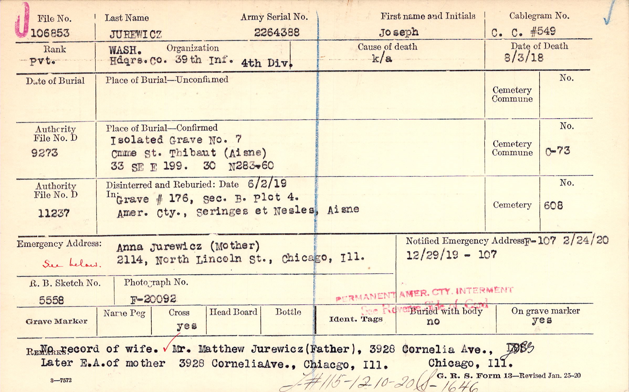 No record of wife. Mr. Matthew Jurewicz (Father), 3928 Cornelia Ave., Later E.A. of mother 3928 CorneliaAve., Chicago, I11, F#115-12-10-20 (S-1646