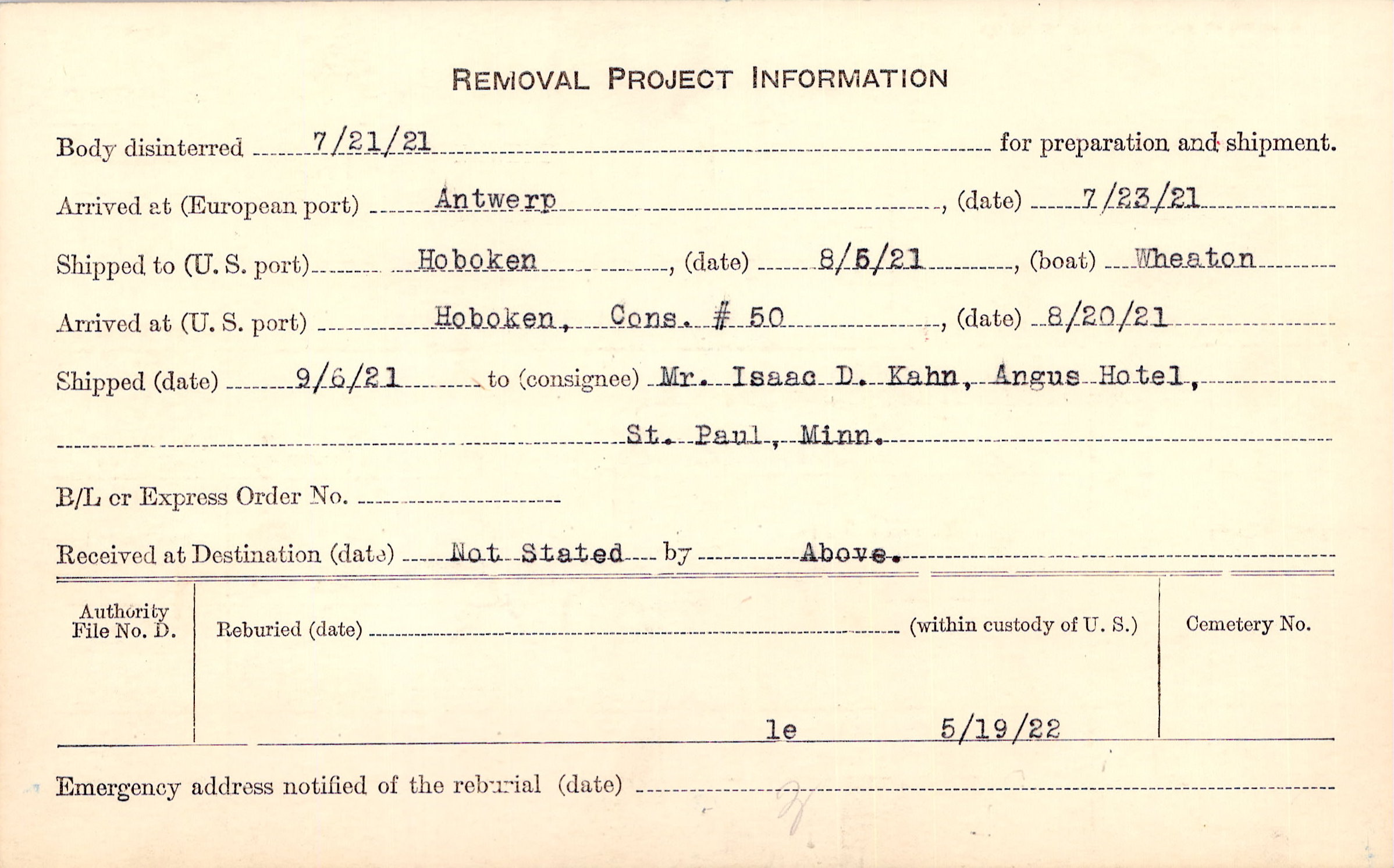F115 5-11-21 S#100. Beneficiary: Isaac Kahn (Father) c/o Angus Hotel, St. Paul Minn.