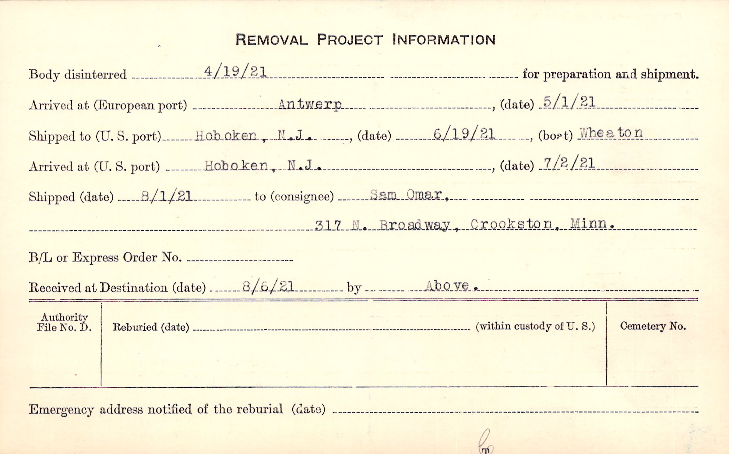 Body disinterred 4/19/1921 for preparation and shipment.